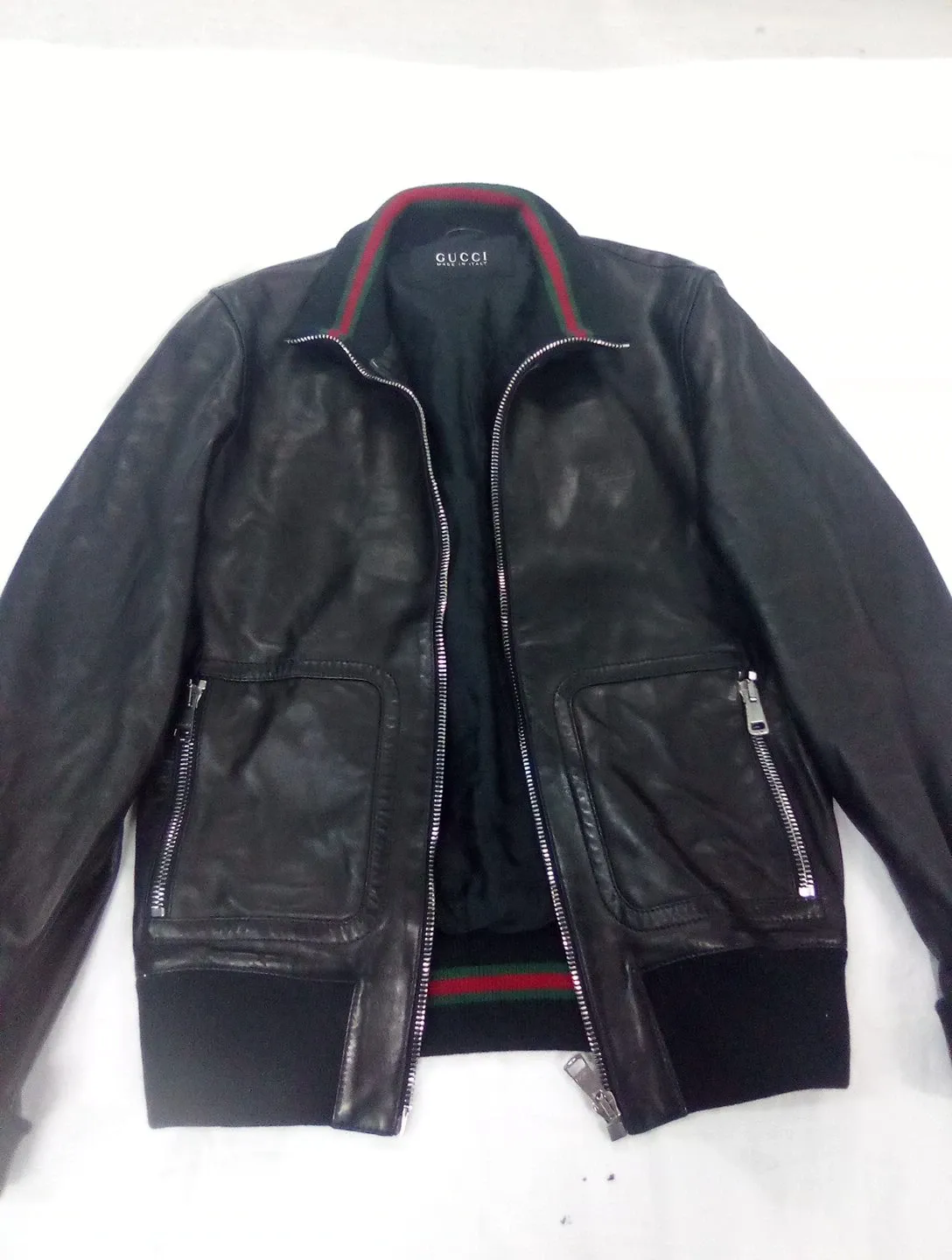 This is a Gucci black leather bomber jacket with a striped collar and cuffs. It has a full zip closure and front pockets. Leather material.
