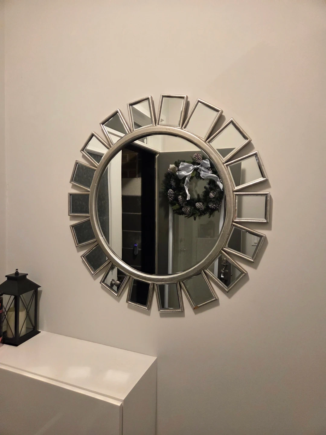 Selling a round decorative mirror with a silver frame. It features small rectangular mirror accents around the perimeter, adding a unique touch to any room. Perfect for adding light and style to your space!