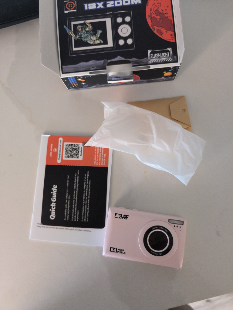 Selling a cute pink digital camera that boasts 64 megapixels! It comes with its original box and a quick guide to help you get started. Perfect for capturing memories on the go