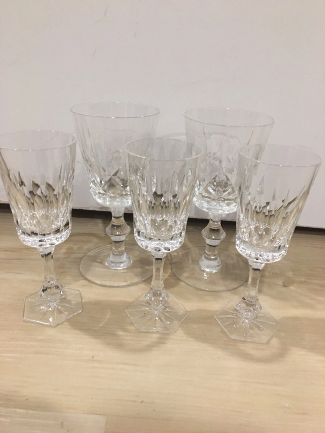 Each glass features intricate diamond and vertical cut patterns on the bowl and a hexagonal base. Perfect for serving wine or other beverages at a dinner party.