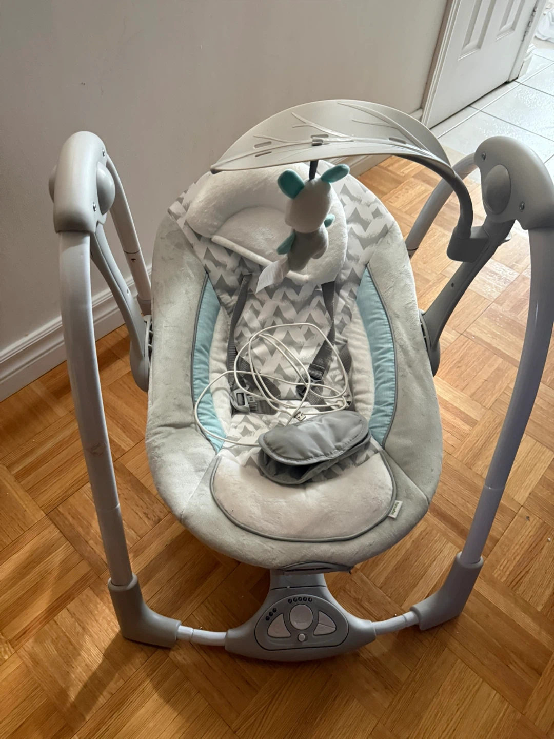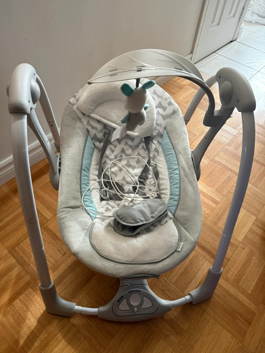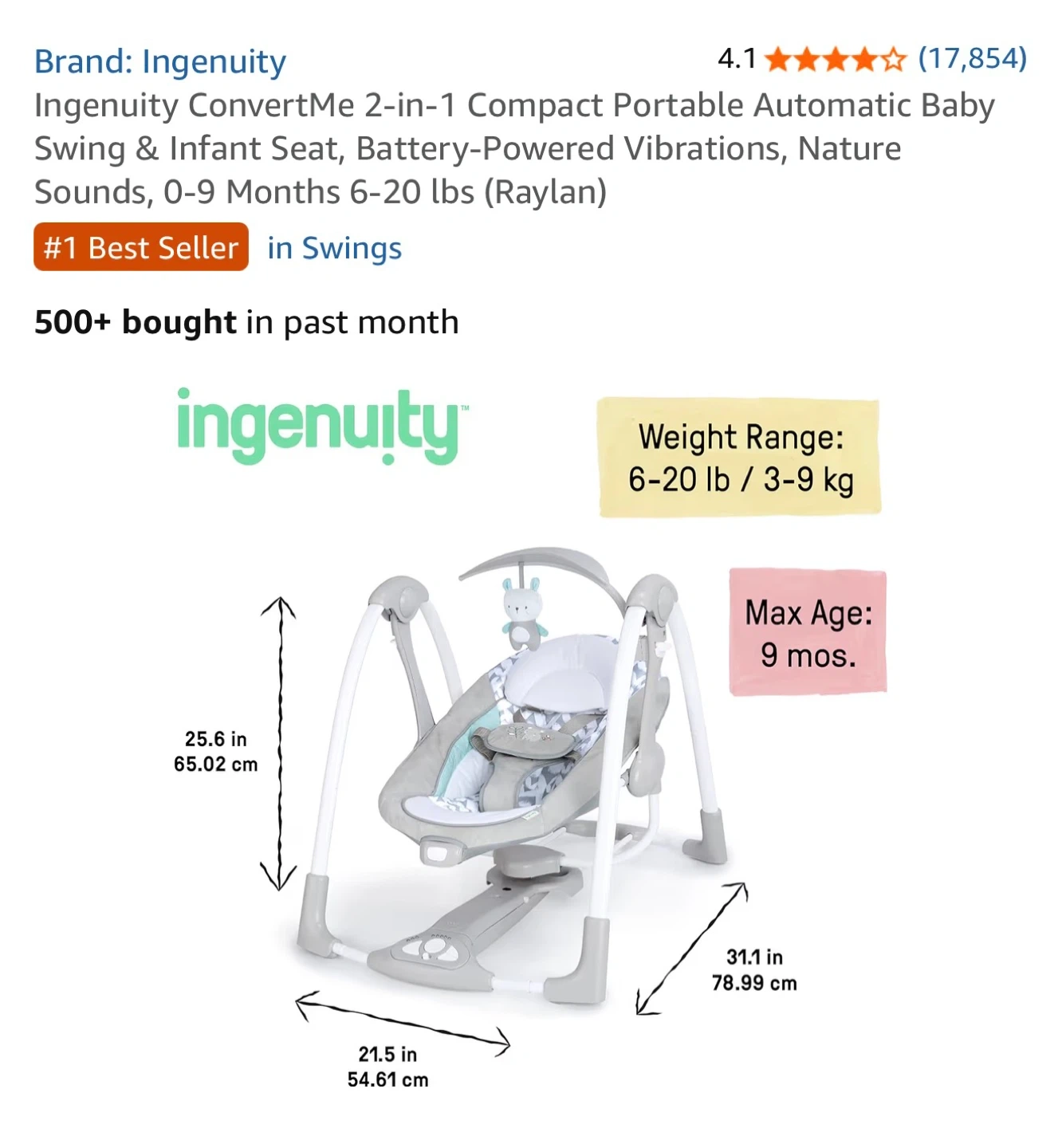 This Ingenuity ConvertMe 2-in-1 swing offers battery-powered vibrations and soothing nature sounds for your baby. It's designed for infants from 0-9 months, with a weight range of 6-20 lbs. The compact, portable design makes it easy to use at home or on the go.