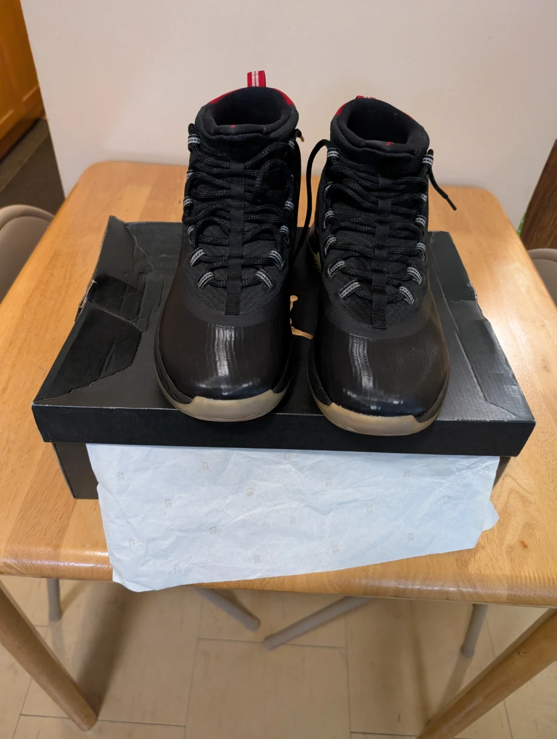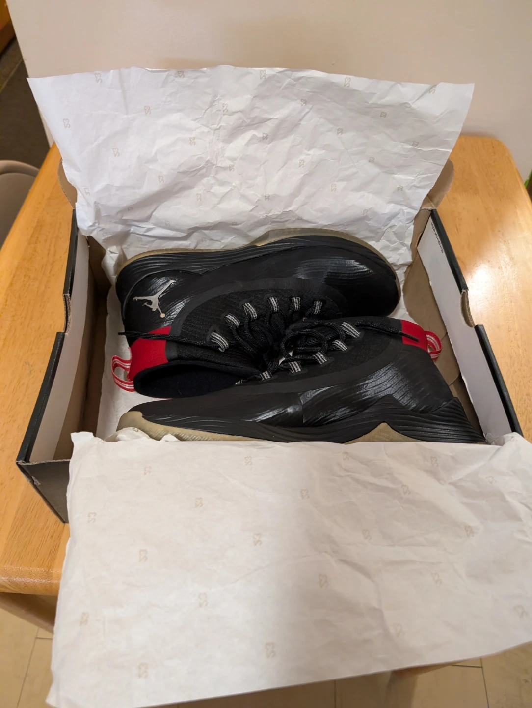 These are Jordan Ultra Fly 2 basketball shoes. They're black with red accents. Includes original box and tissue paper. Brand new never worn size 10.5