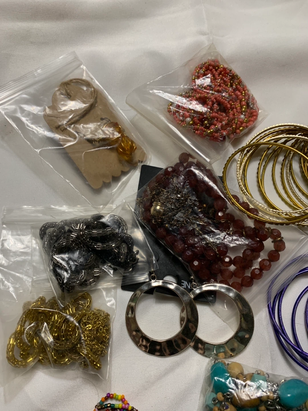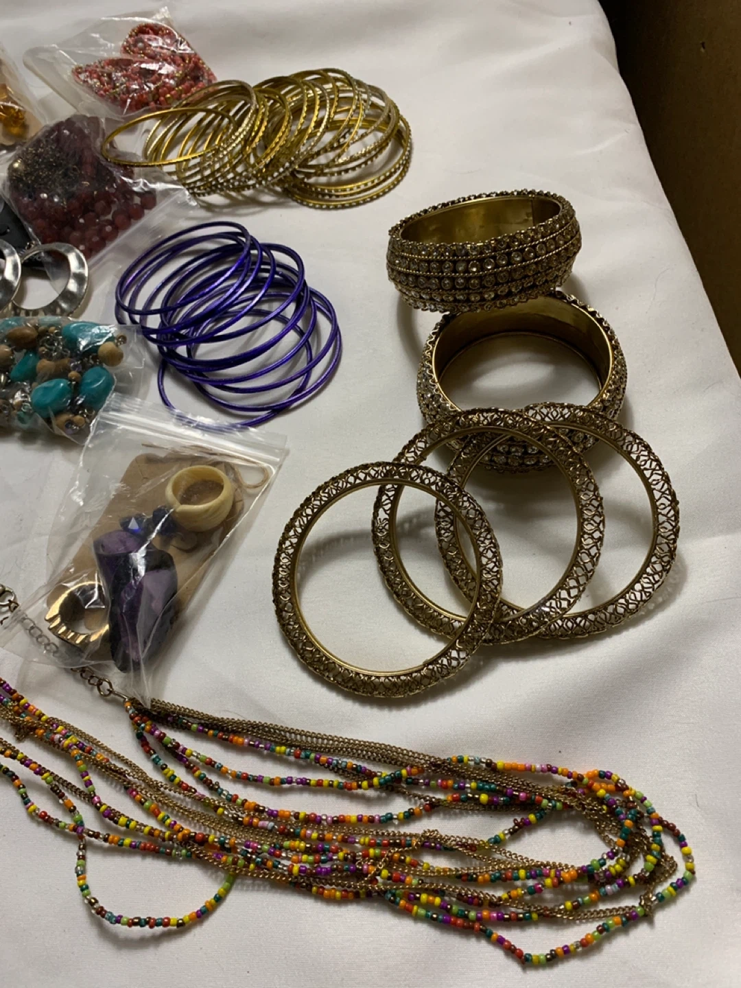 This is a collection of costume jewellery, including bangles, necklaces, and earrings. The set features gold-tone, silver-tone, and beaded pieces. Great for adding a pop of colour and style to any outfit!