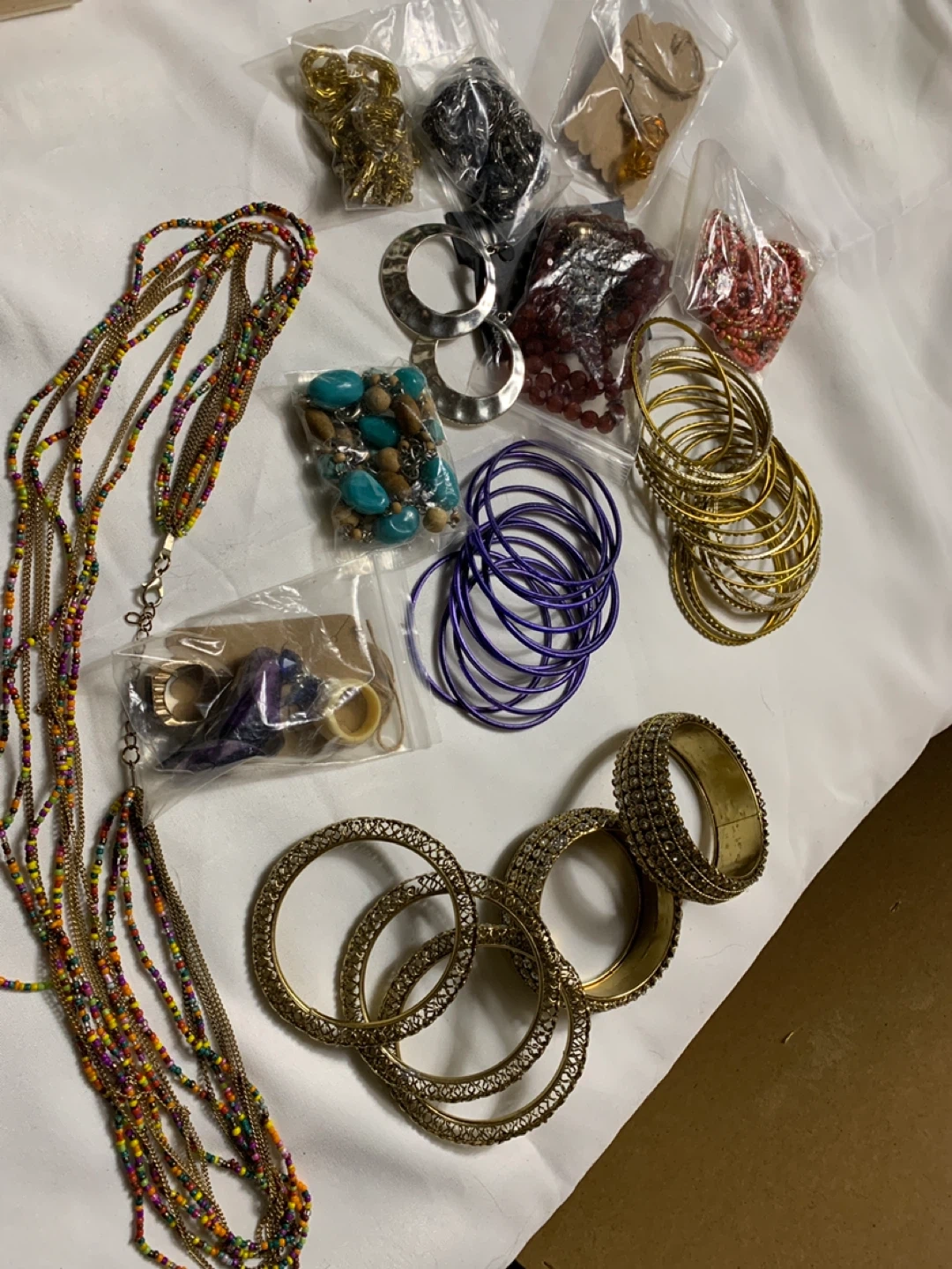 This is a collection of costume jewellery, including bangles, necklaces, and earrings. The set features gold-tone, silver-tone, and beaded pieces. Great for adding a pop of colour and style to any outfit!