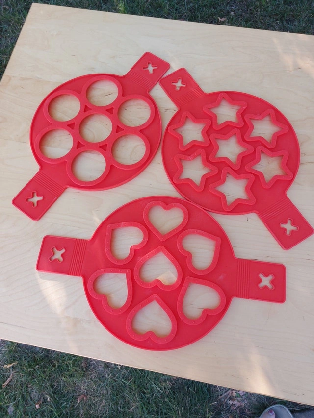 These silicone holders are designed to be placed in a frying pan to help you make cool shaped pancakes. They are new and have never been used. Selling all 3 together.