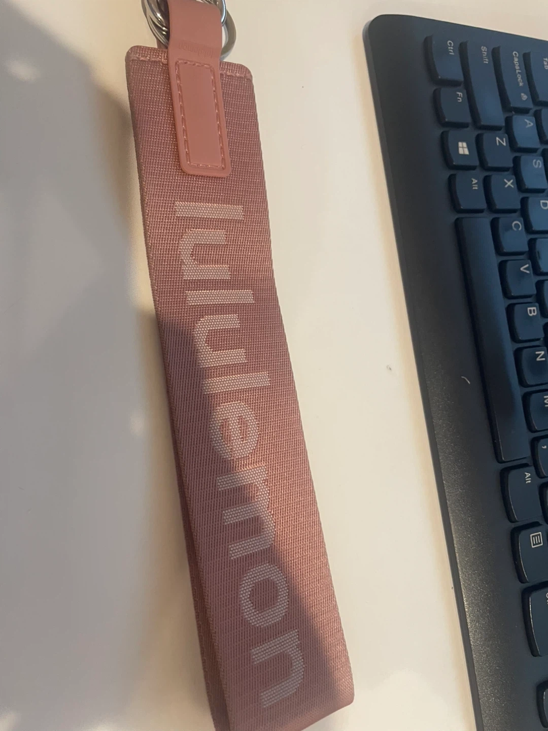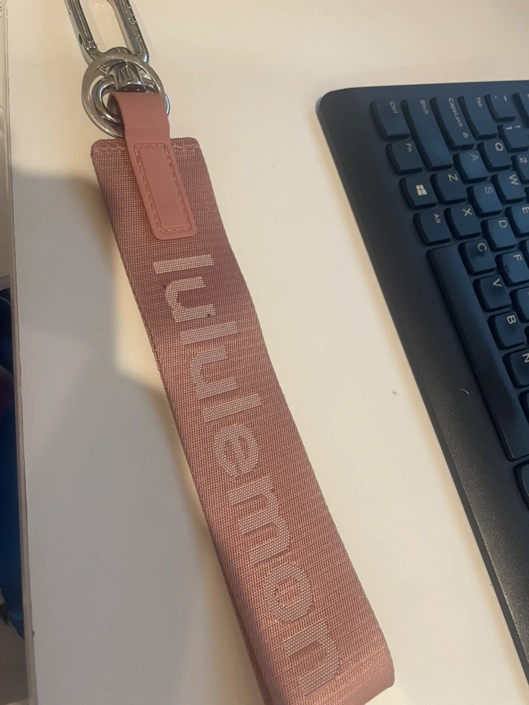 Here's a Lululemon wrist strap keychain in a lovely pink colour! It's perfect for keeping your keys handy and adding a touch of style to your everyday carry