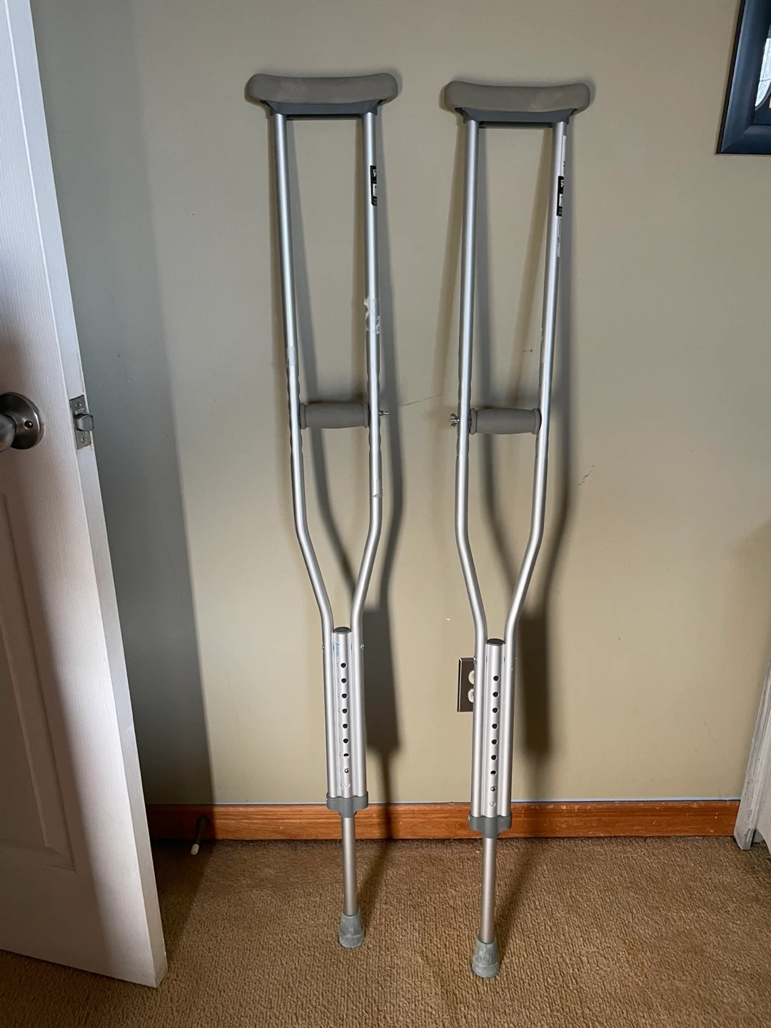 A pair of adult crutches. Aluminum construction with adjustable height settings. Features padded handgrips and rubber tips for stability. Weight capacity of 350 lbs.