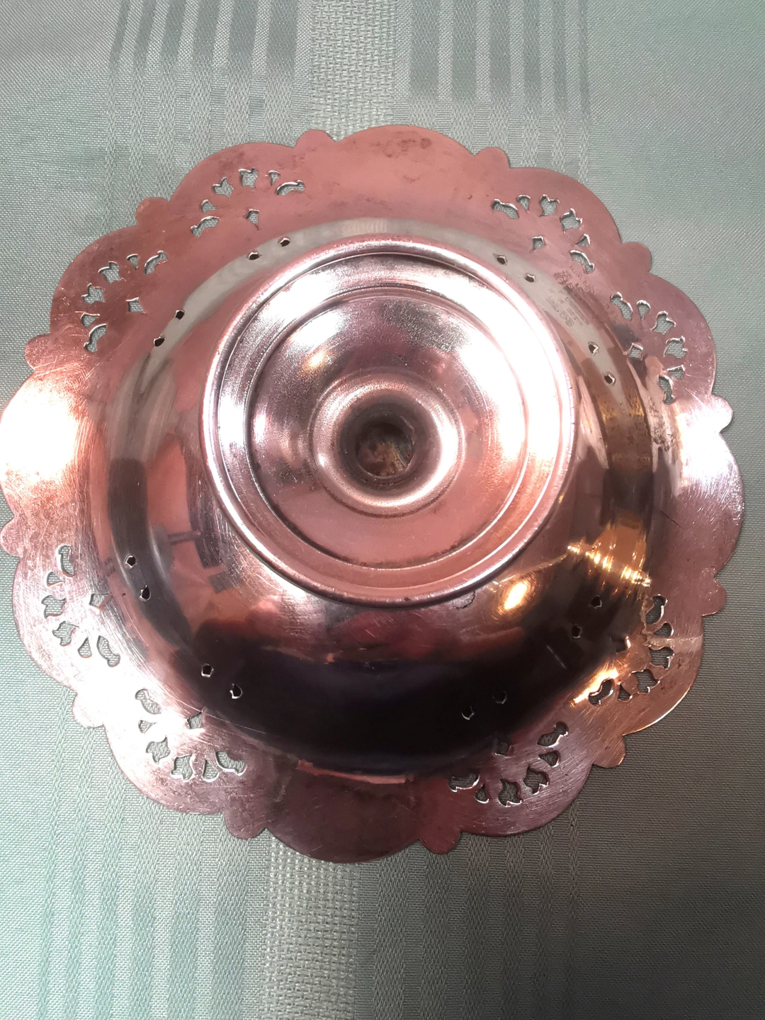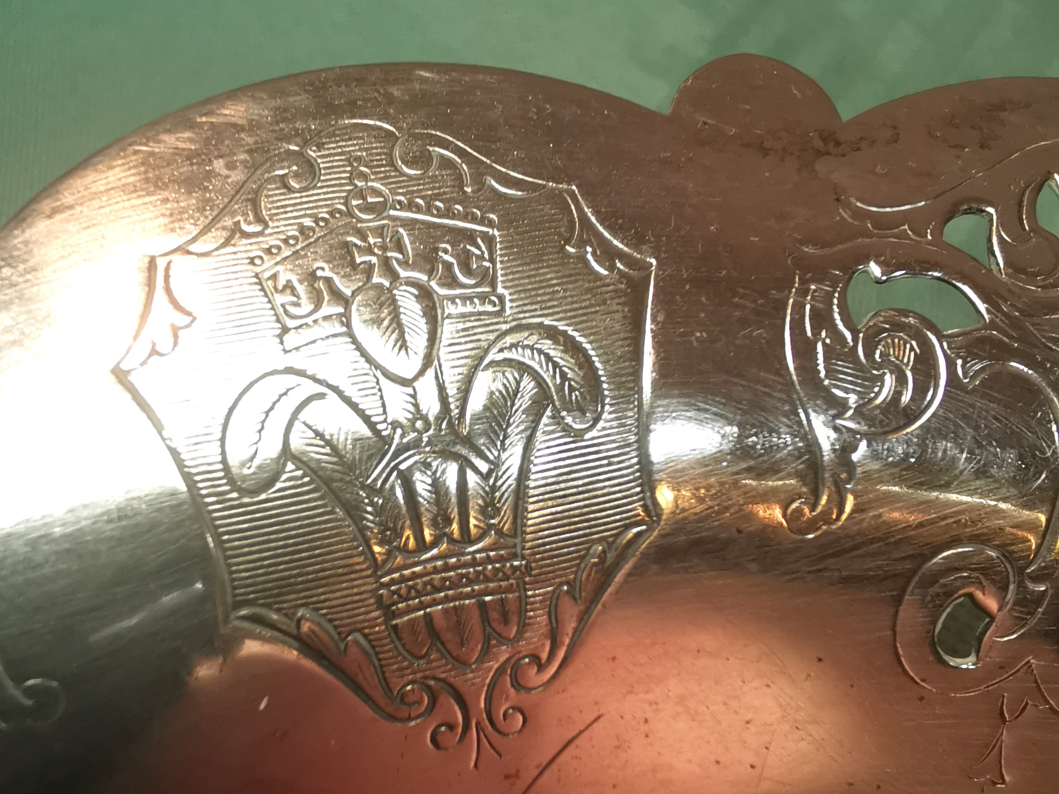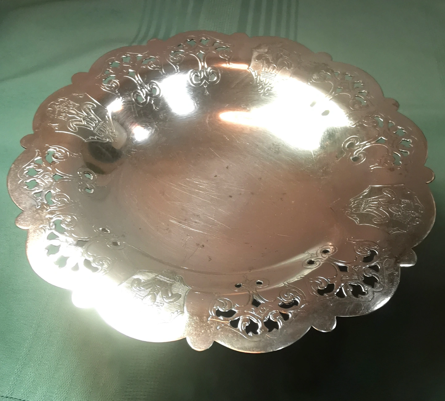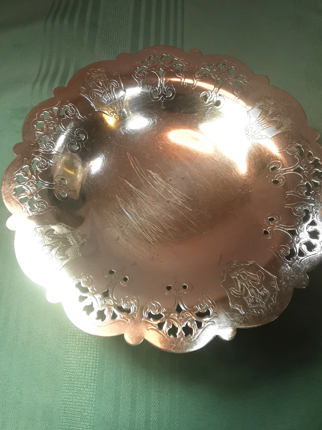 This item is in good antique condition light wear consistent with its 1930s origin. There are no deep gouges or dents. The silver plating remains strong with only very minor surface micro-scratching and light tarnish in the recessed areas of the pattern.