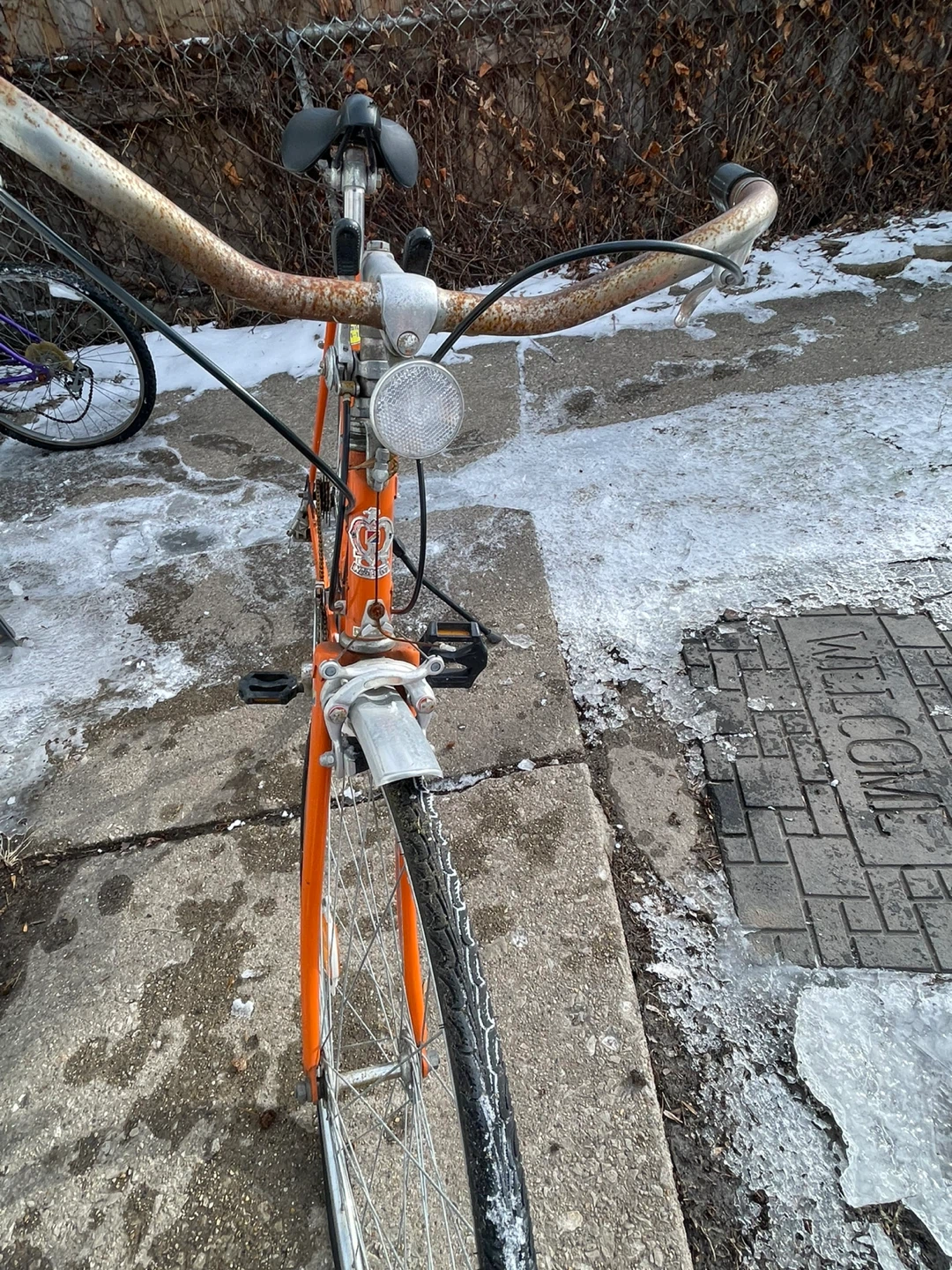 The frame is in decent condition with some scratches, however the handle is very rusted as well as the chain and gears. The seat is damaged and the cables are rusted. Sold as is.