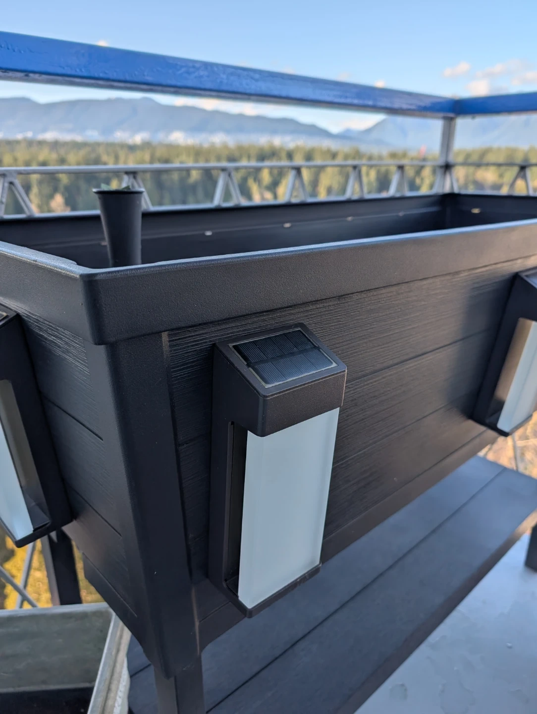 This raised garden bed is made of durable black plastic. It features 4 LED solar powered lights.