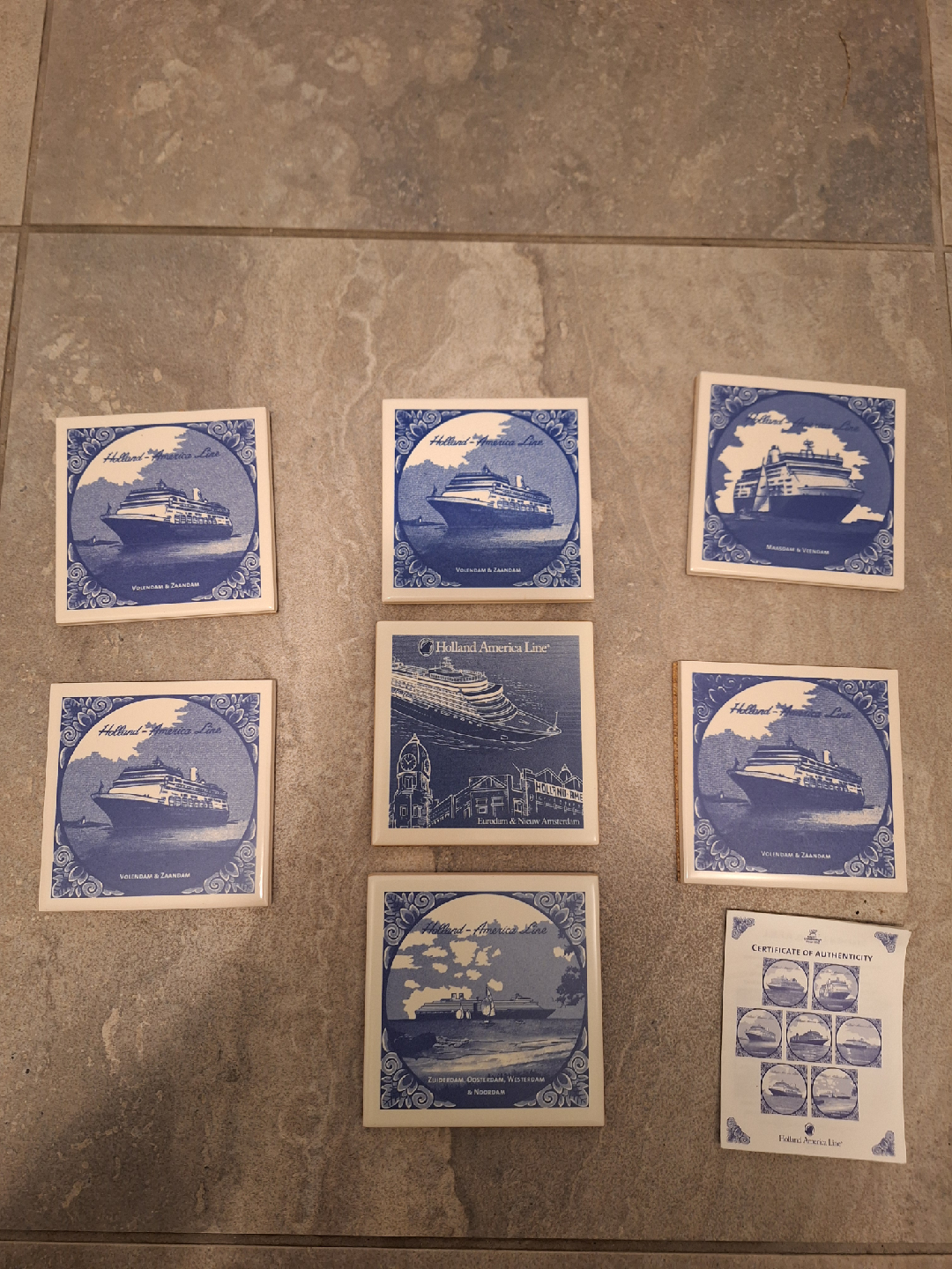 Selling a set of seven Holland America Line cruise ship coasters. These are a lovely blue and white colour, featuring different ships and ports. Includes a certificate of authenticity. Perfect for a cruise enthusiast or collector!