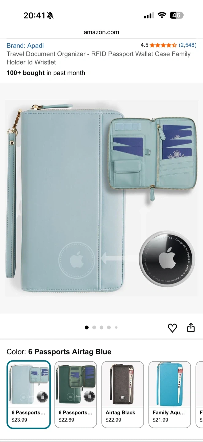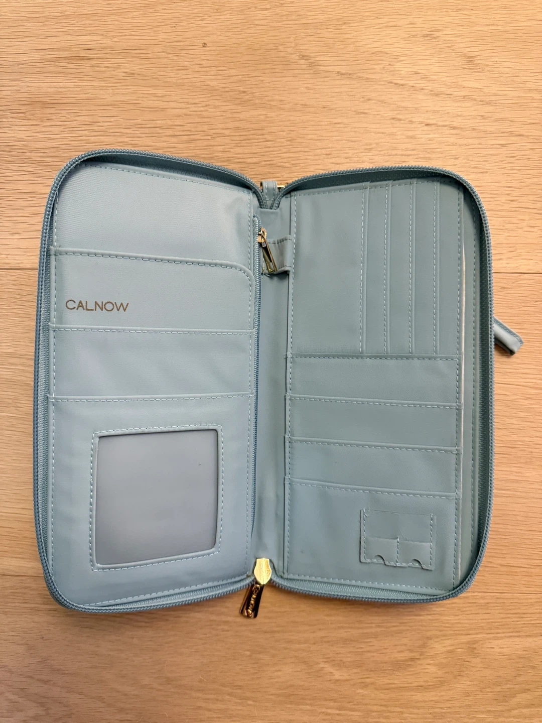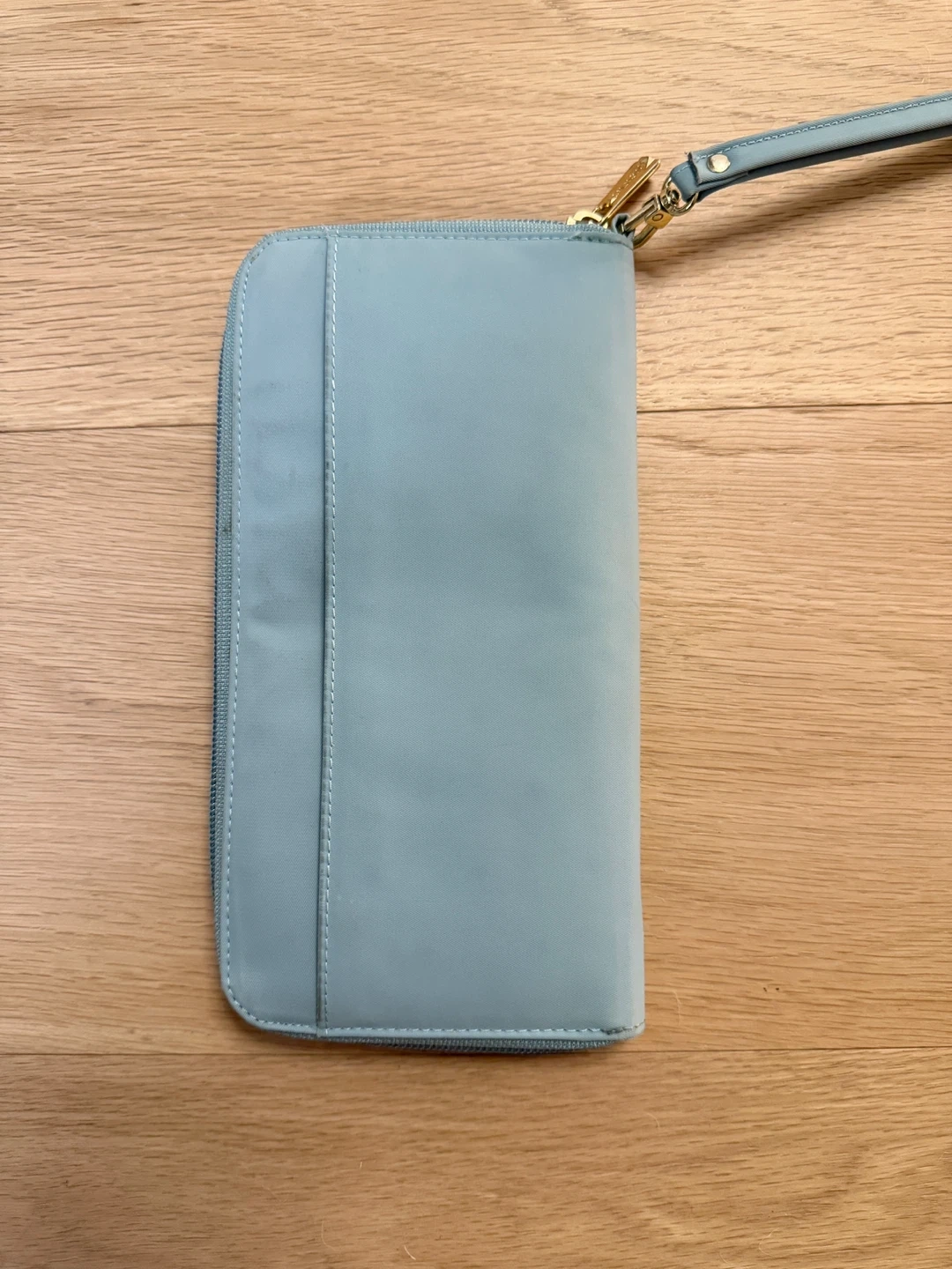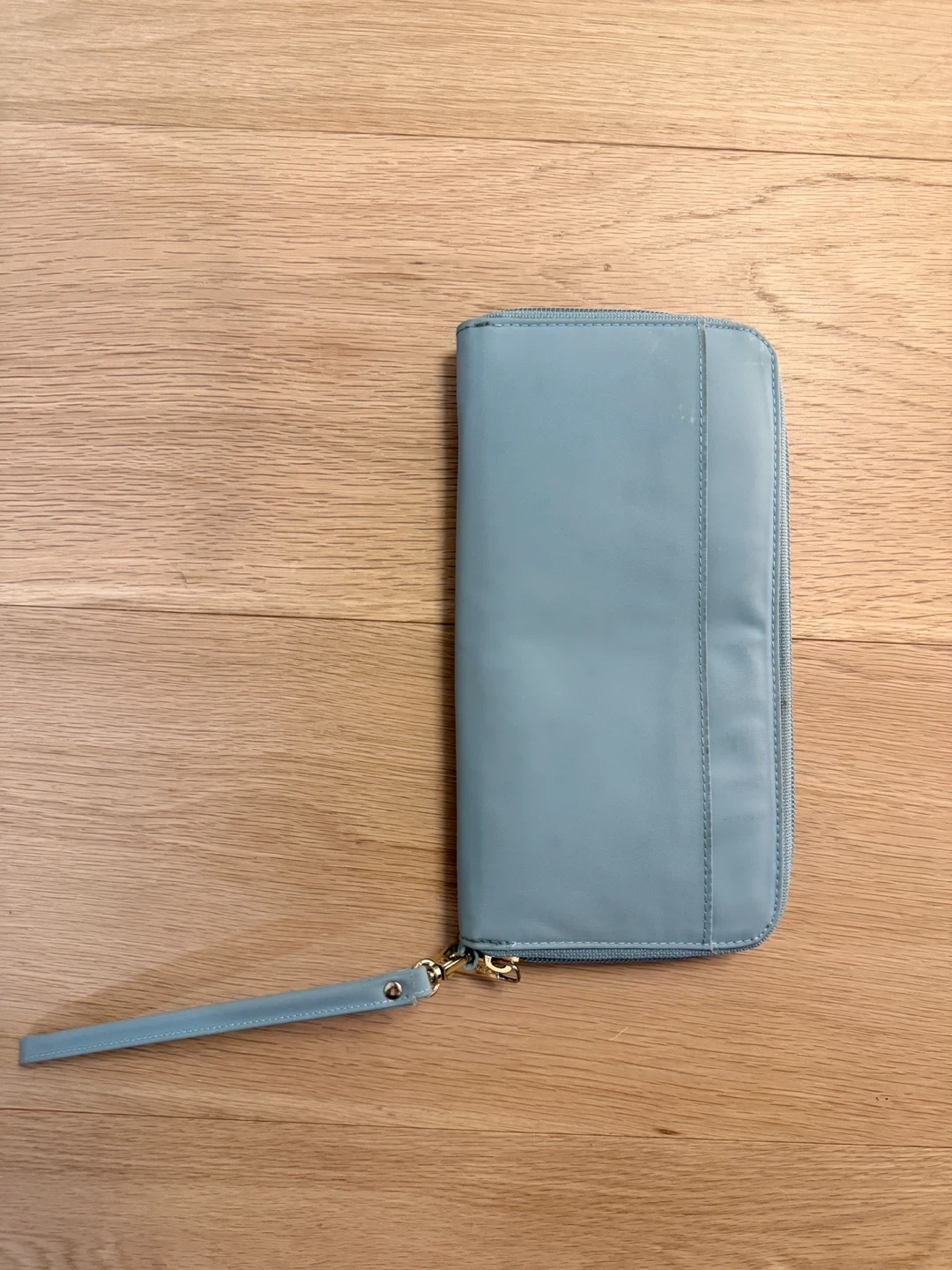 In great condition. This travel document organizer is a passport wallet with a wristlet. It's blue and has RFID protection. It includes multiple card slots and compartments for documents.