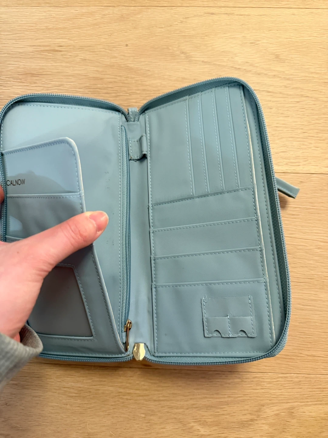 In great condition. This travel document organizer is a passport wallet with a wristlet. It's blue and has RFID protection. It includes multiple card slots and compartments for documents.