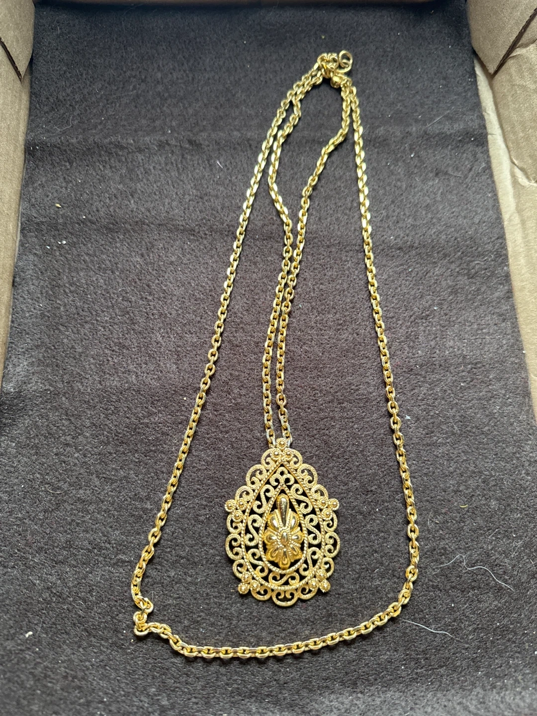 This is a beautiful gold tone pendant necklace. The pendant features an intricate filigree design with a central motif. Its classic style makes it a versatile accessory.