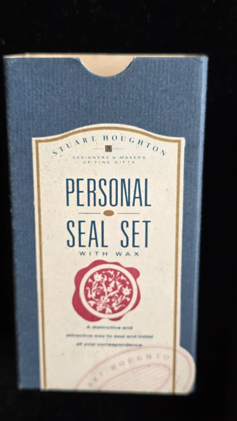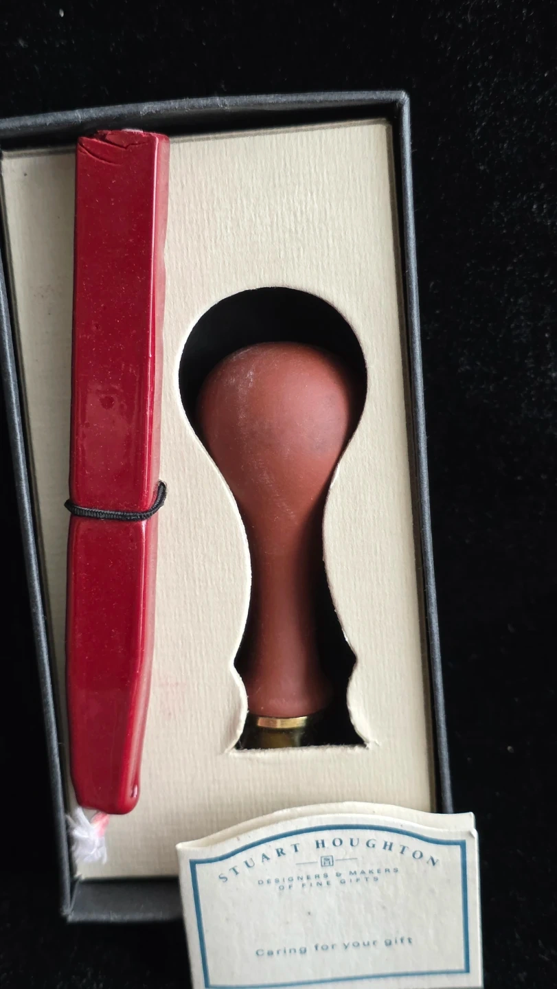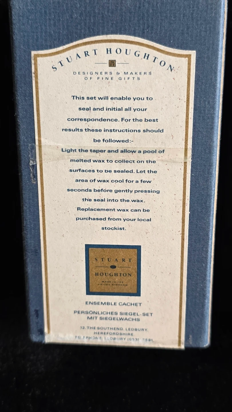 This is a personal seal set with wax from Stuart Houghton. It's designed for sealing correspondence. Instructions for use are included.