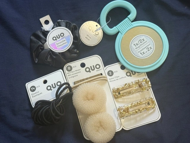 Get this variety pack of Quo Beauty accessories! This set includes a scrunchie, elastics, mini bun makers, salon clips, and a compact mirror. These items are all new and ready to add some flair to your style.