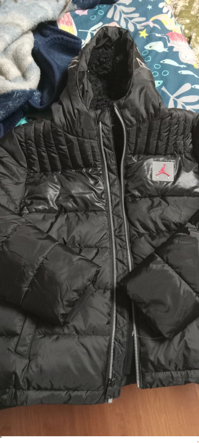 Black puffer jacket. Features a zipper closure, multiple pockets, and a fleece-lined hood. Air Jordan branding throughout.