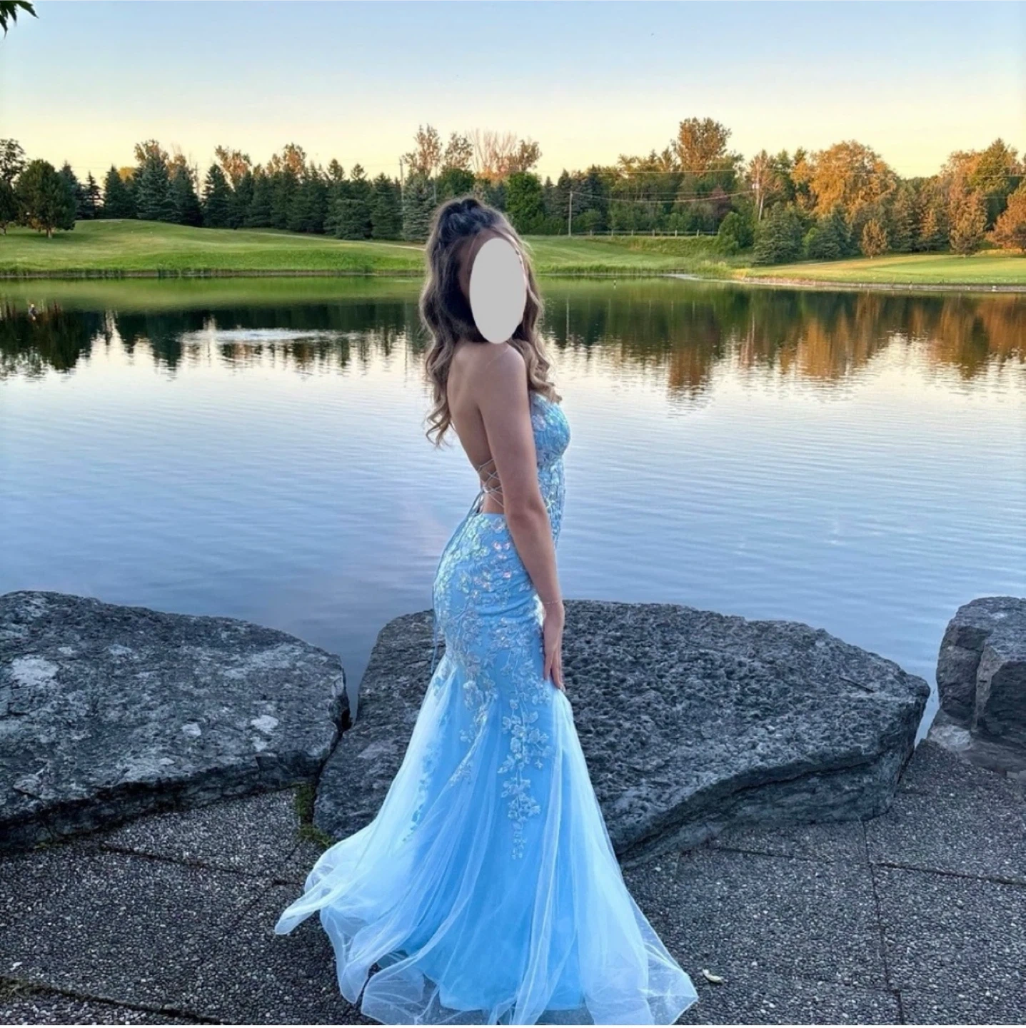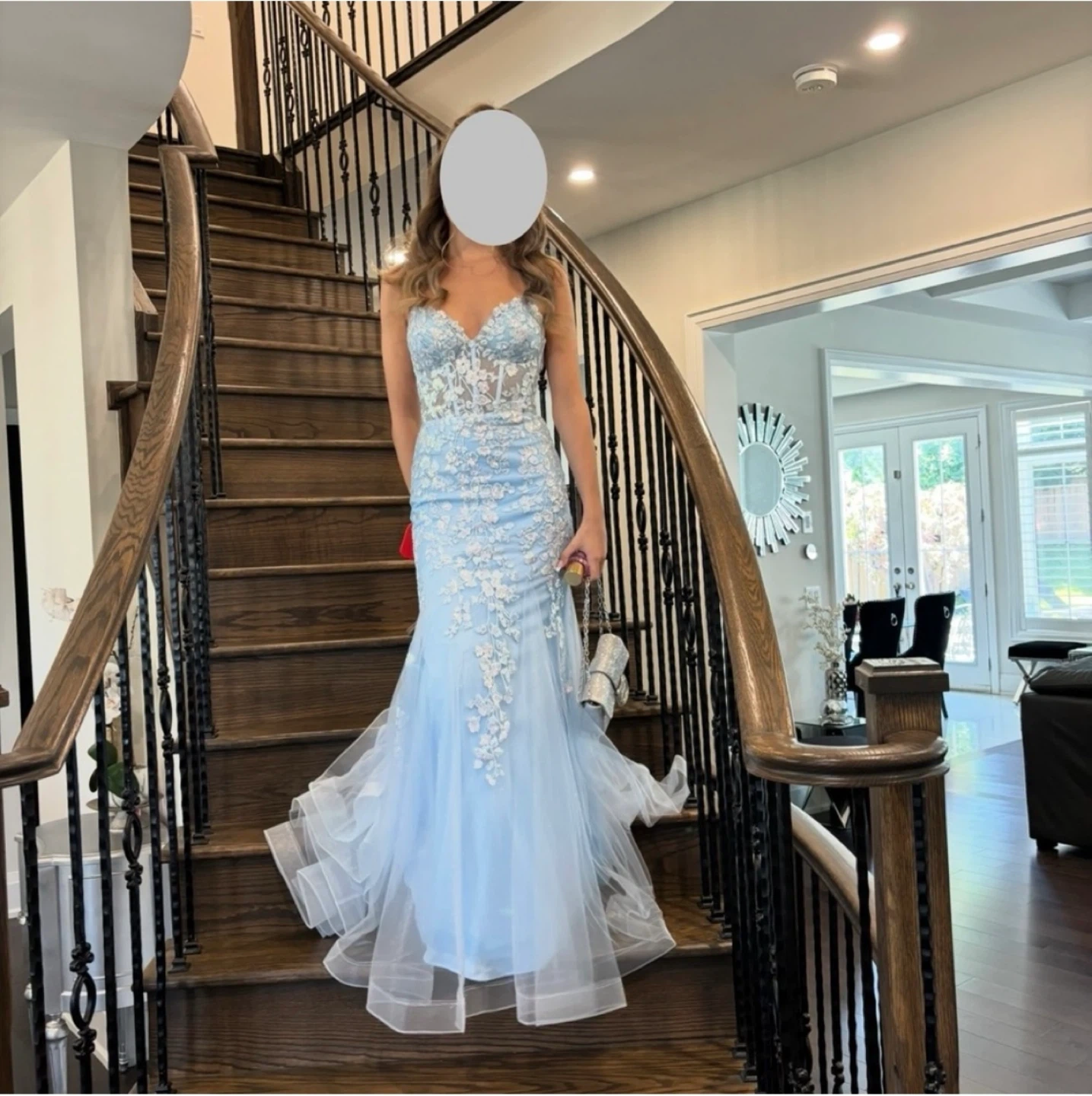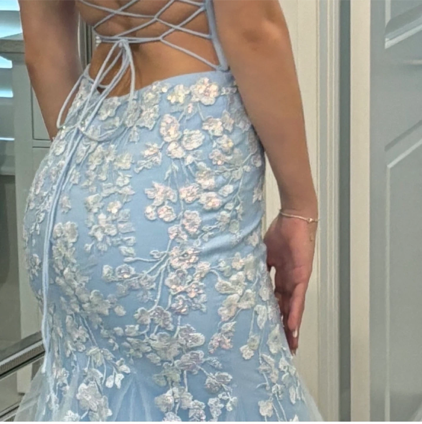 Gorgeous light blue mermaid prom dress with intricate sequin and floral appliques. It features a flattering corset bodice and a delicate criss-cross back detail. This dress is perfect for formal events or a special occasion!