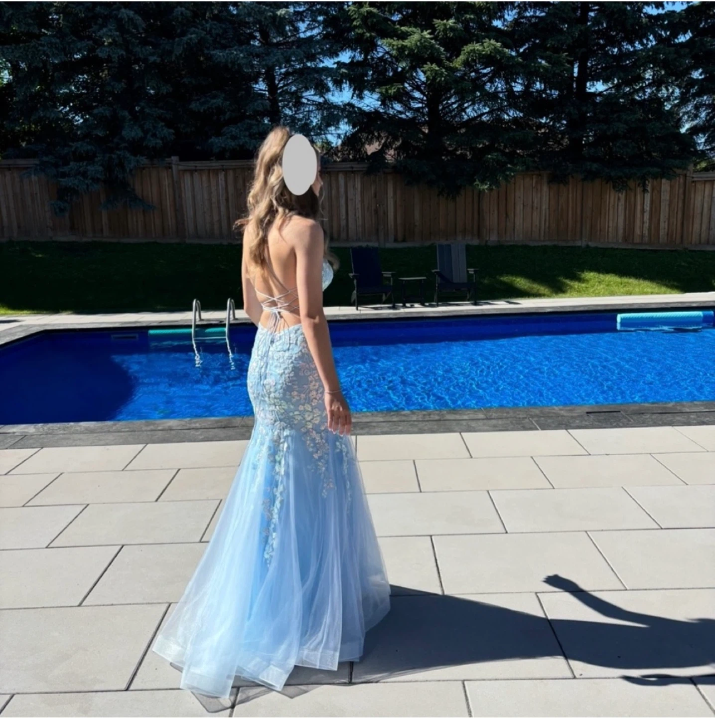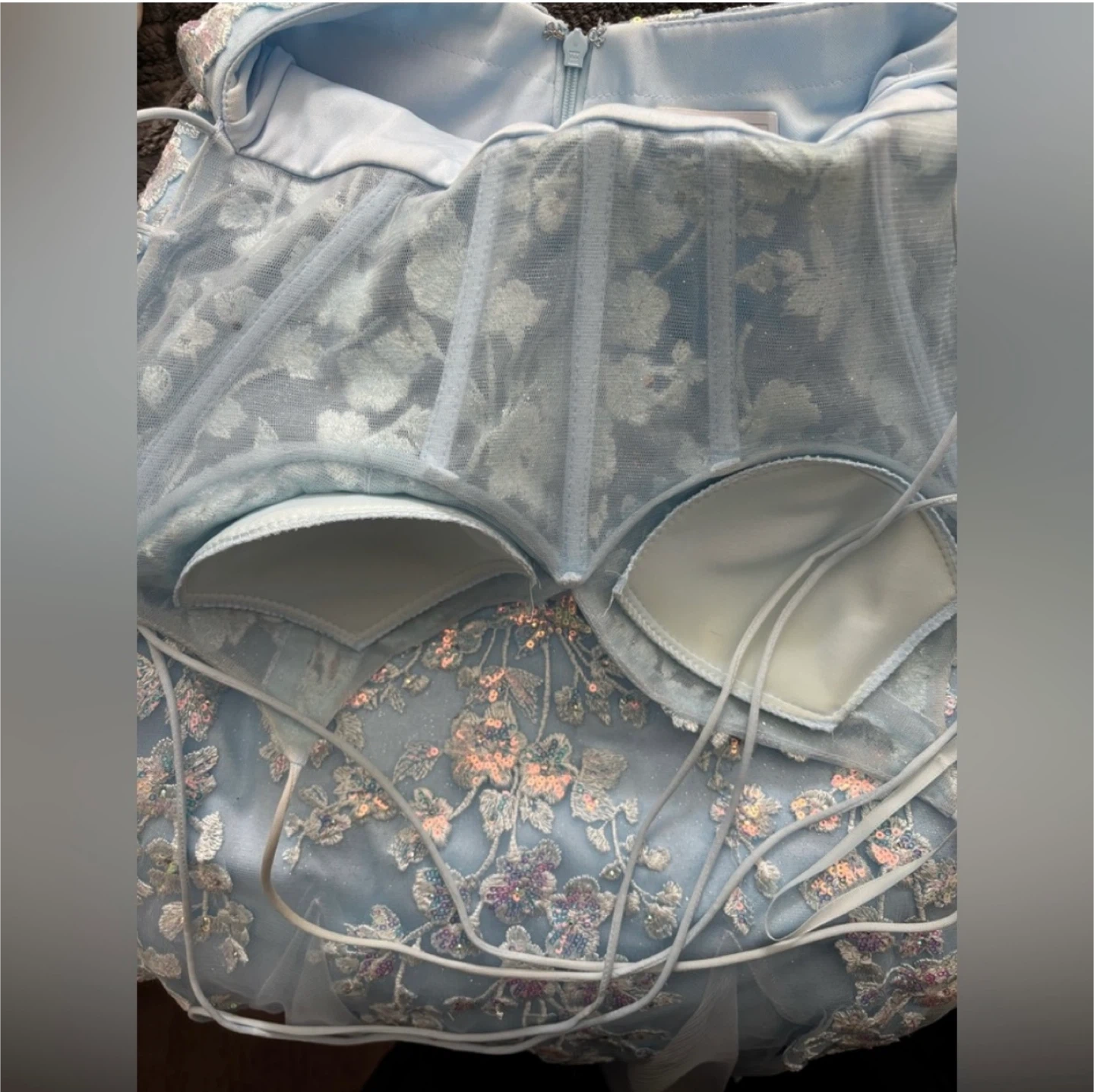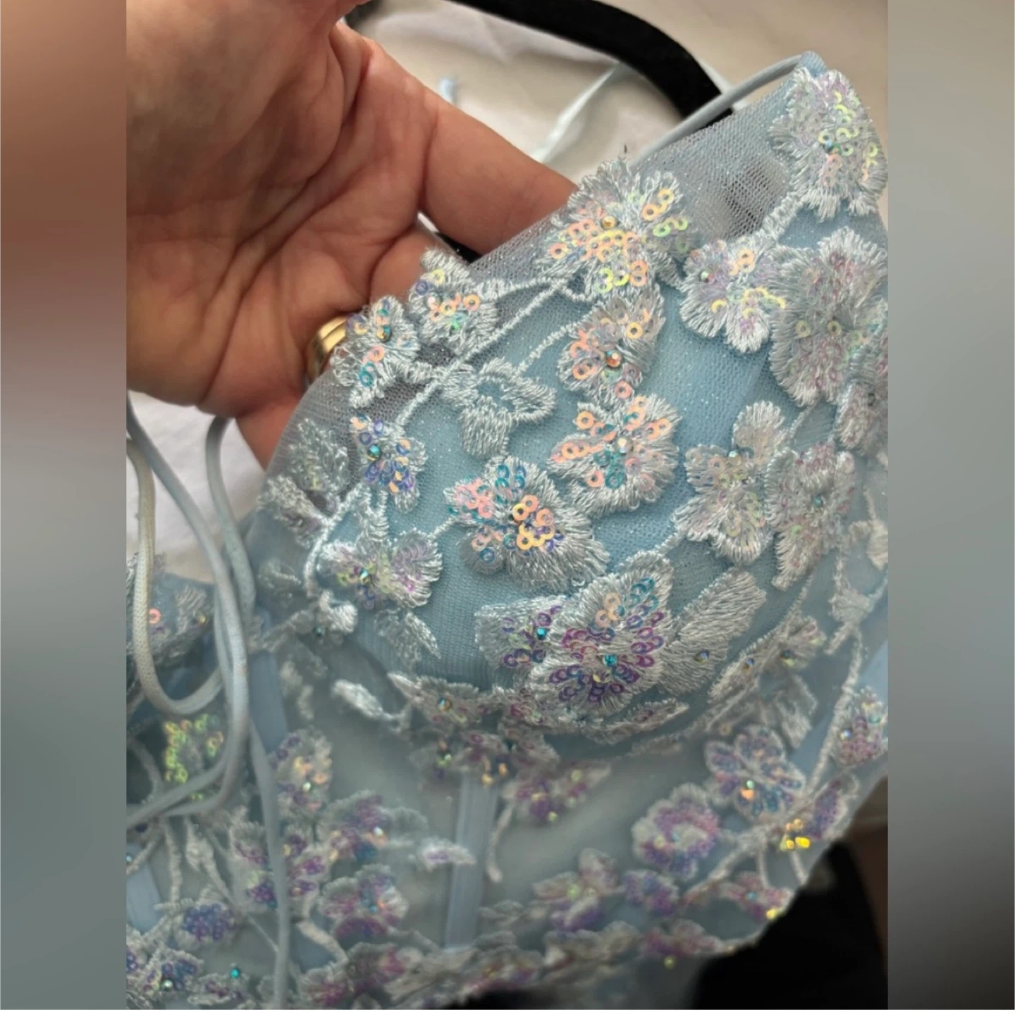 Gorgeous light blue mermaid prom dress with intricate sequin and floral appliques. It features a flattering corset bodice and a delicate criss-cross back detail. This dress is perfect for formal events or a special occasion!