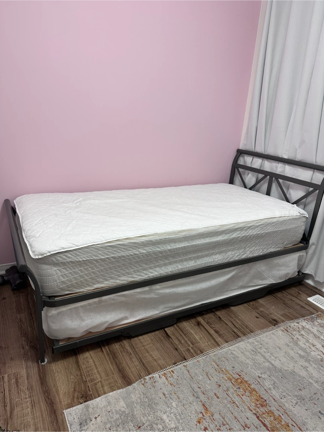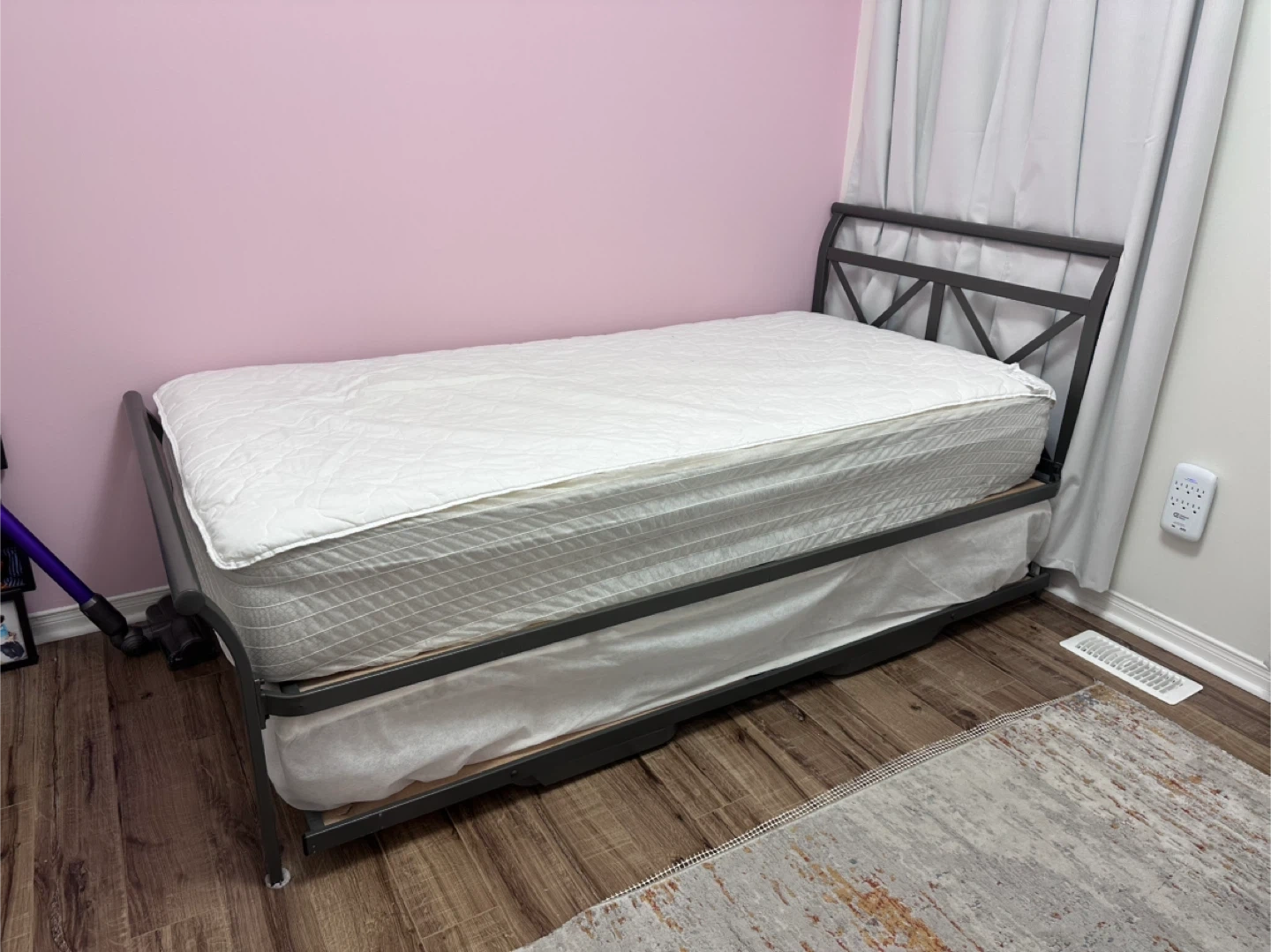 This daybed features a sturdy metal frame and includes a pull-out trundle. It's perfect for saving space in smaller rooms. The mattresses are included.