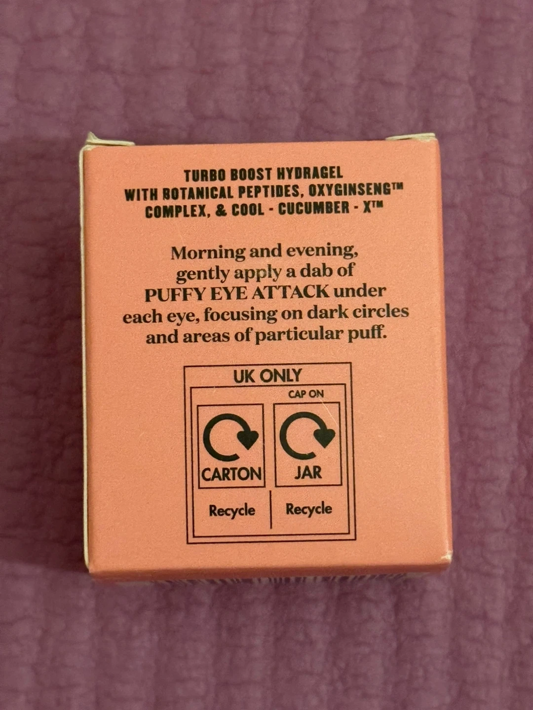 This is Soap & Glory Puffy Eye Attack Turbo Boost Hydragel eye treatment. It contains botanical peptides, oxyginseng complex, and cool cucumber. Apply morning and evening to target dark circles and puffiness. It's 14 ml (0.47 fl. oz.).