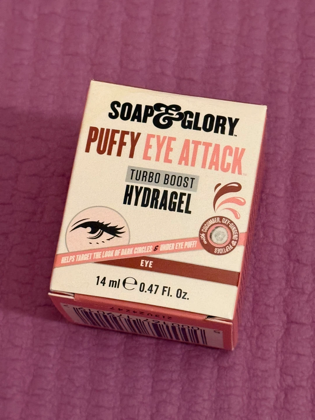 This is Soap & Glory Puffy Eye Attack Turbo Boost Hydragel eye treatment. It contains botanical peptides, oxyginseng complex, and cool cucumber. Apply morning and evening to target dark circles and puffiness. It's 14 ml (0.47 fl. oz.).