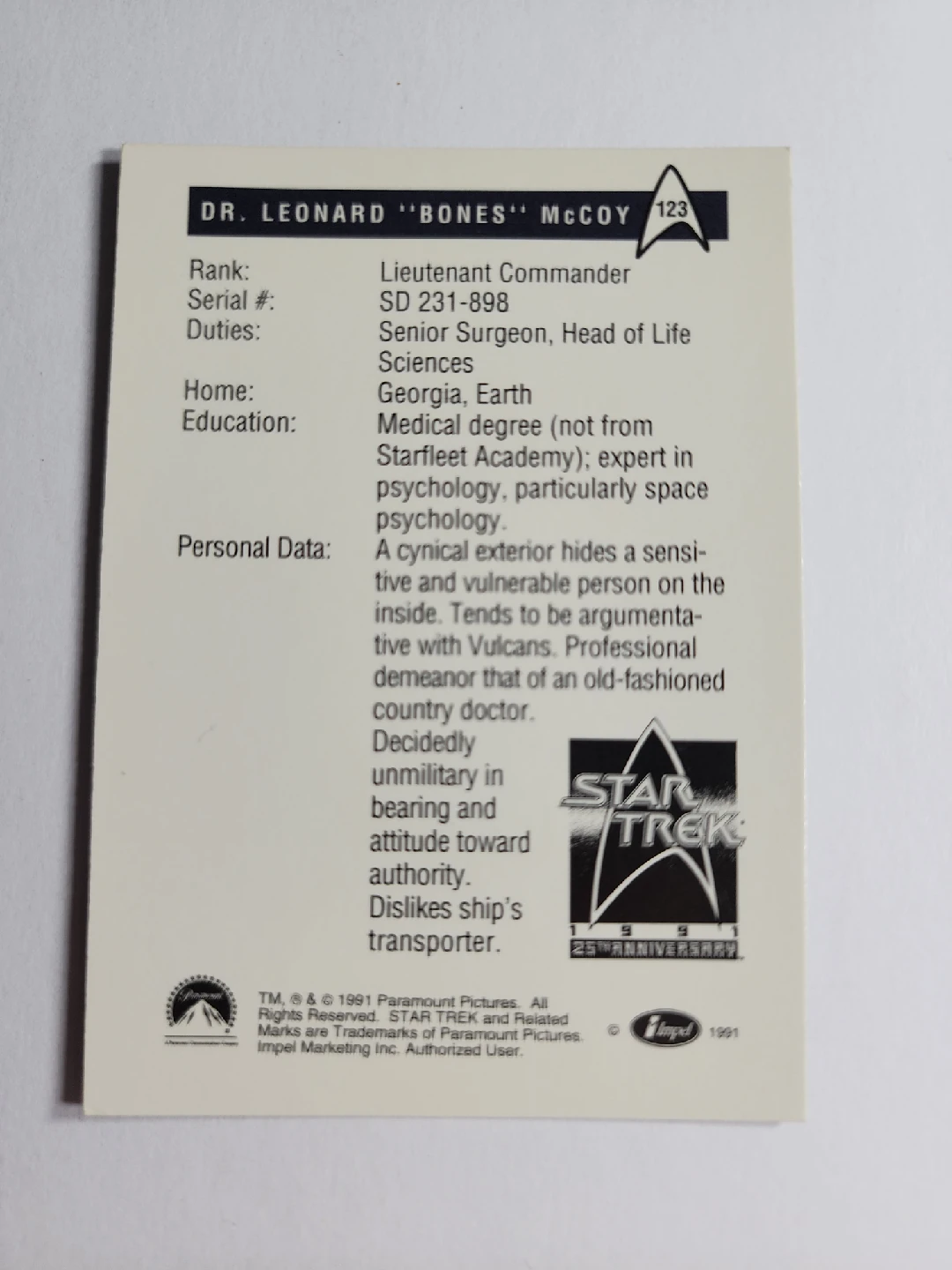 Selling a Star Trek trading card featuring Dr. Leonard "Bones" McCoy. The card details his rank, duties, home, and education. It also has the Star Trek 25th Anniversary logo. Great for any Star Trek fan!