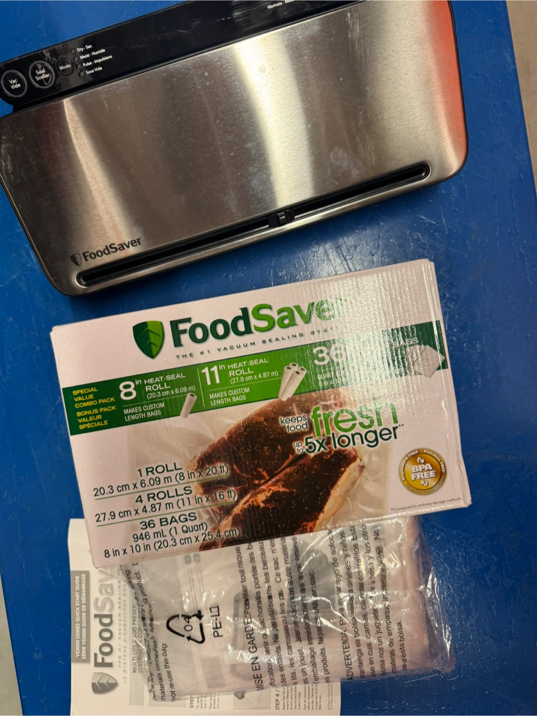 Selling a FoodSaver vacuum sealing system. It includes 1 roll (8 in x 20 ft), 4 rolls (11 in x 16 ft), and 36 bags (8 in x 10 in). It keeps food fresh up to 5x longer!