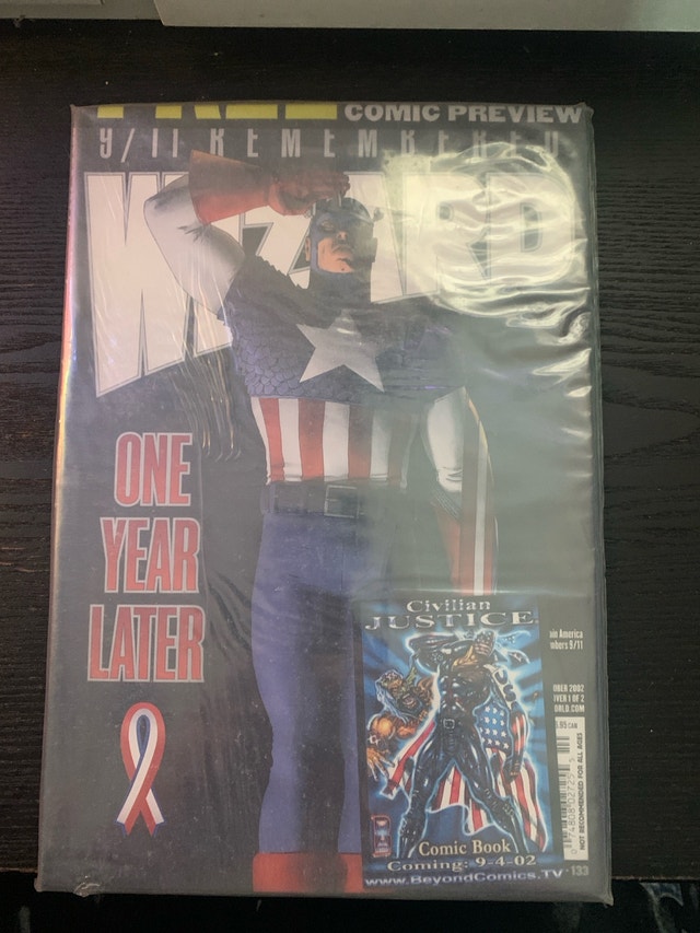 Own a piece of comic book history with this Marvel Comic Preview, 9/11 Remembered One Year Later, Vol #1, #133, Civilian Justice. It's still sealed in its original packaging from August 30, 2002. This is a unique collectible for any comic enthusiast. I'm not a comic book expert, but I've done my best to describe this treasure. If the ad is still up, it's still available, so don't miss out! Cash accepted.