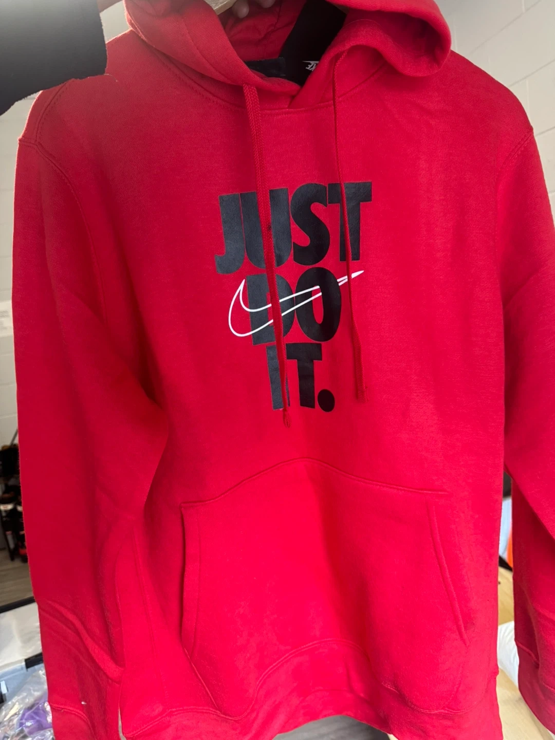 Selling a vibrant red Nike hoodie with the iconic "Just Do It" logo. It's a size large, perfect for staying cozy and stylish. The hoodie is in great condition and ready for a new owner!