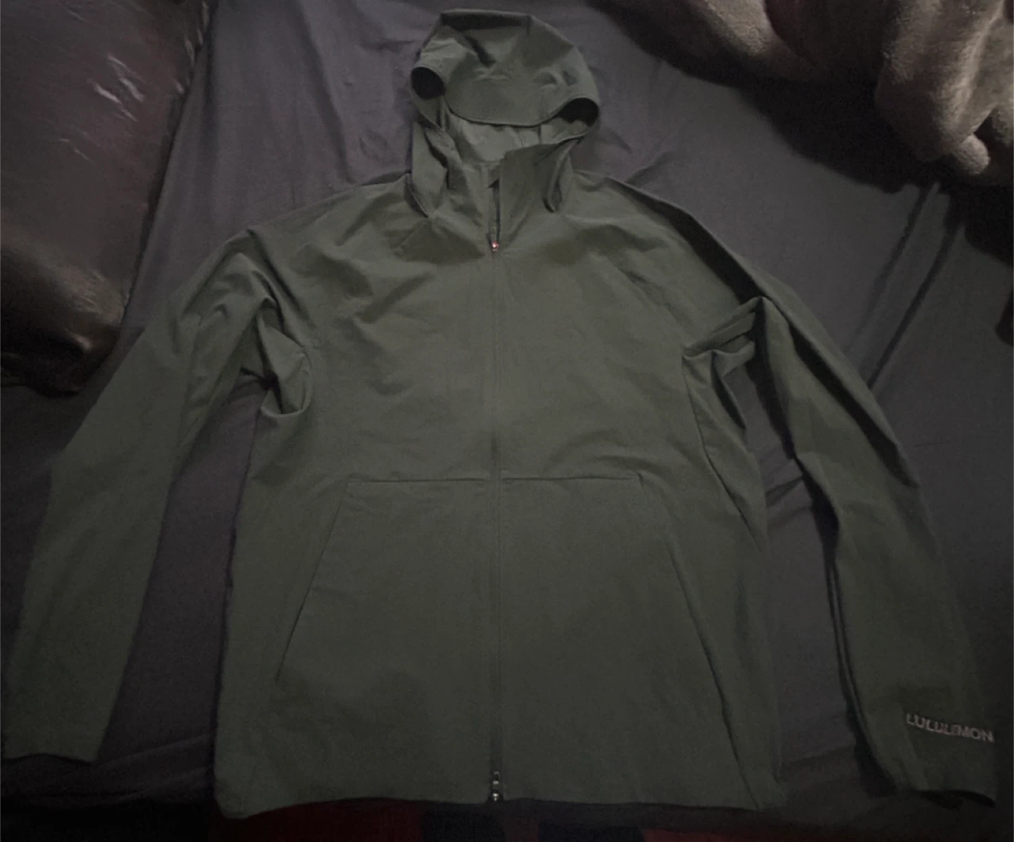 Lululemon athletic set featuring a dark green hooded jacket and matching shorts. Both pieces have the Lululemon logo visible. The jacket is full zip with pockets, and the shorts have an elastic waistband with a drawstring and zippered pockets.