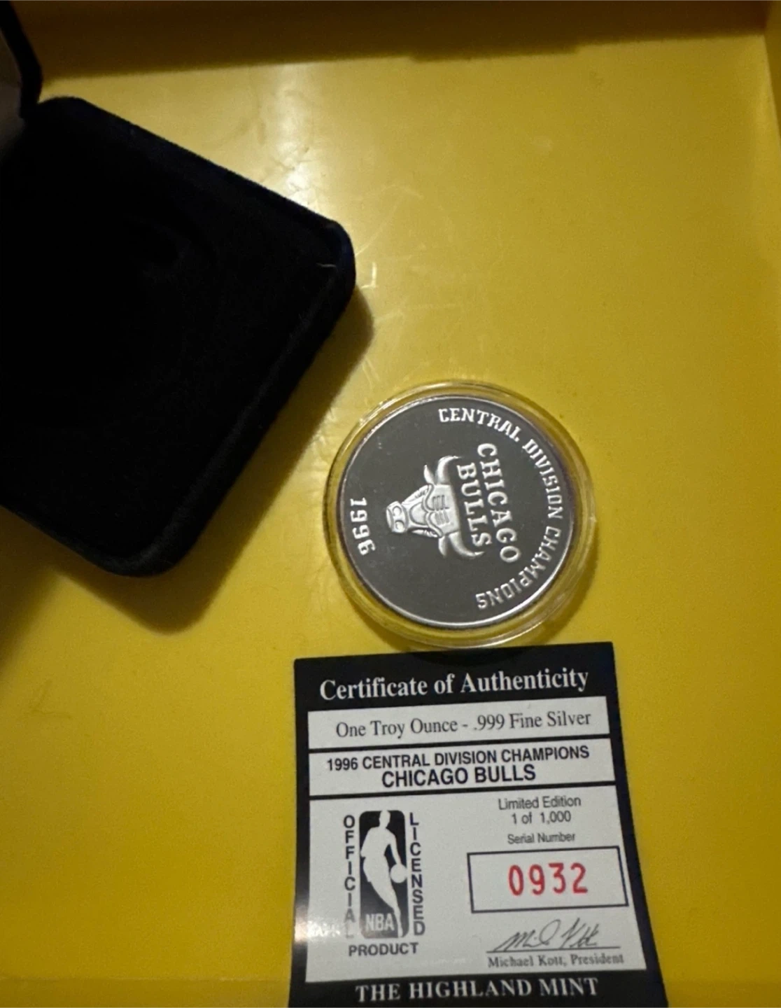 Selling a 1996 Central Division Champions Chicago Bulls .999 1 oz Fine Silver coin. It comes with a certificate of authenticity and is a limited edition, serial number 0932. Made by The Highland Mint.