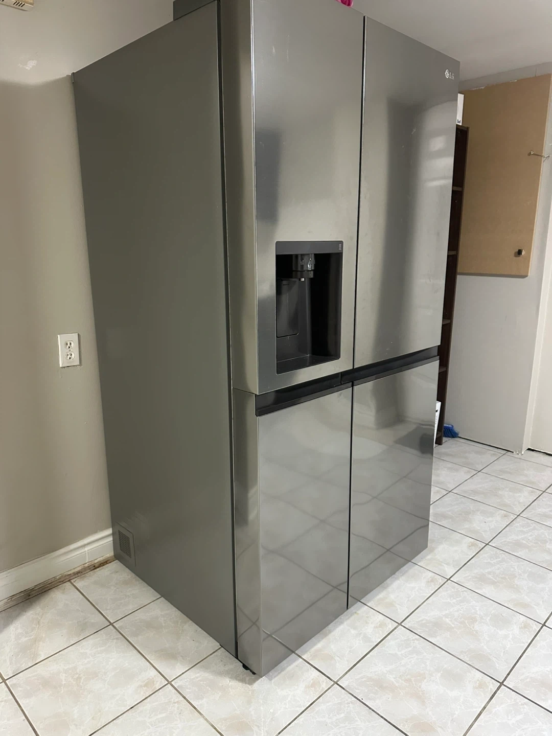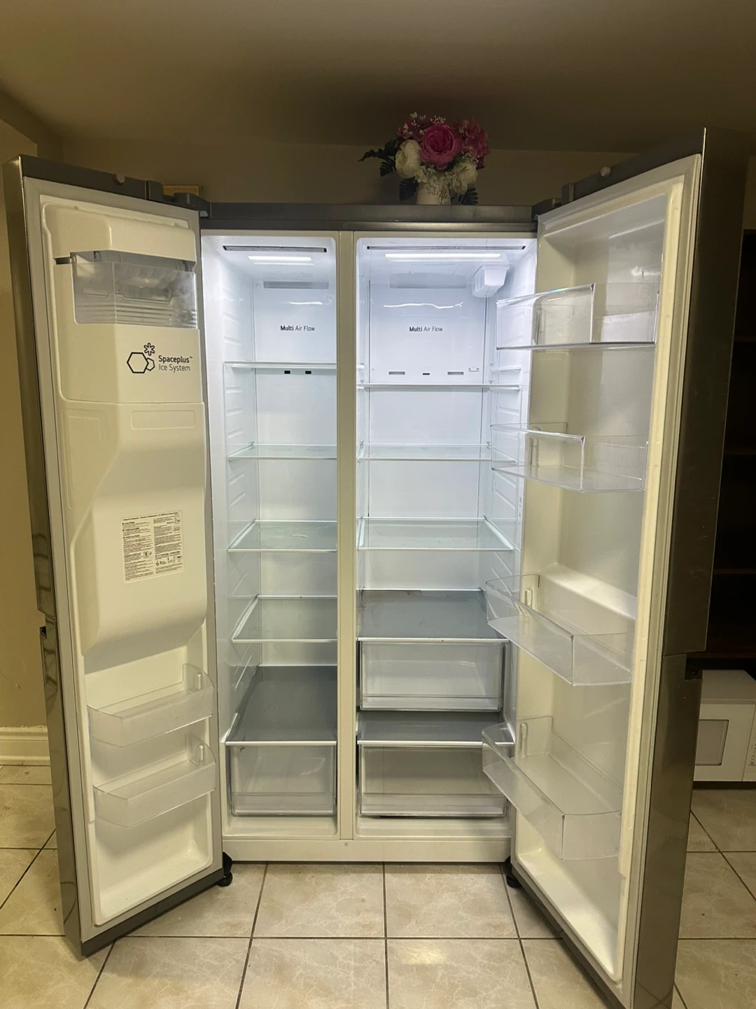 LG stainless steel side-by-side refrigerator. It features multiple air flow for even cooling and an external ice and water dispenser. Comes with the owner's manual.
