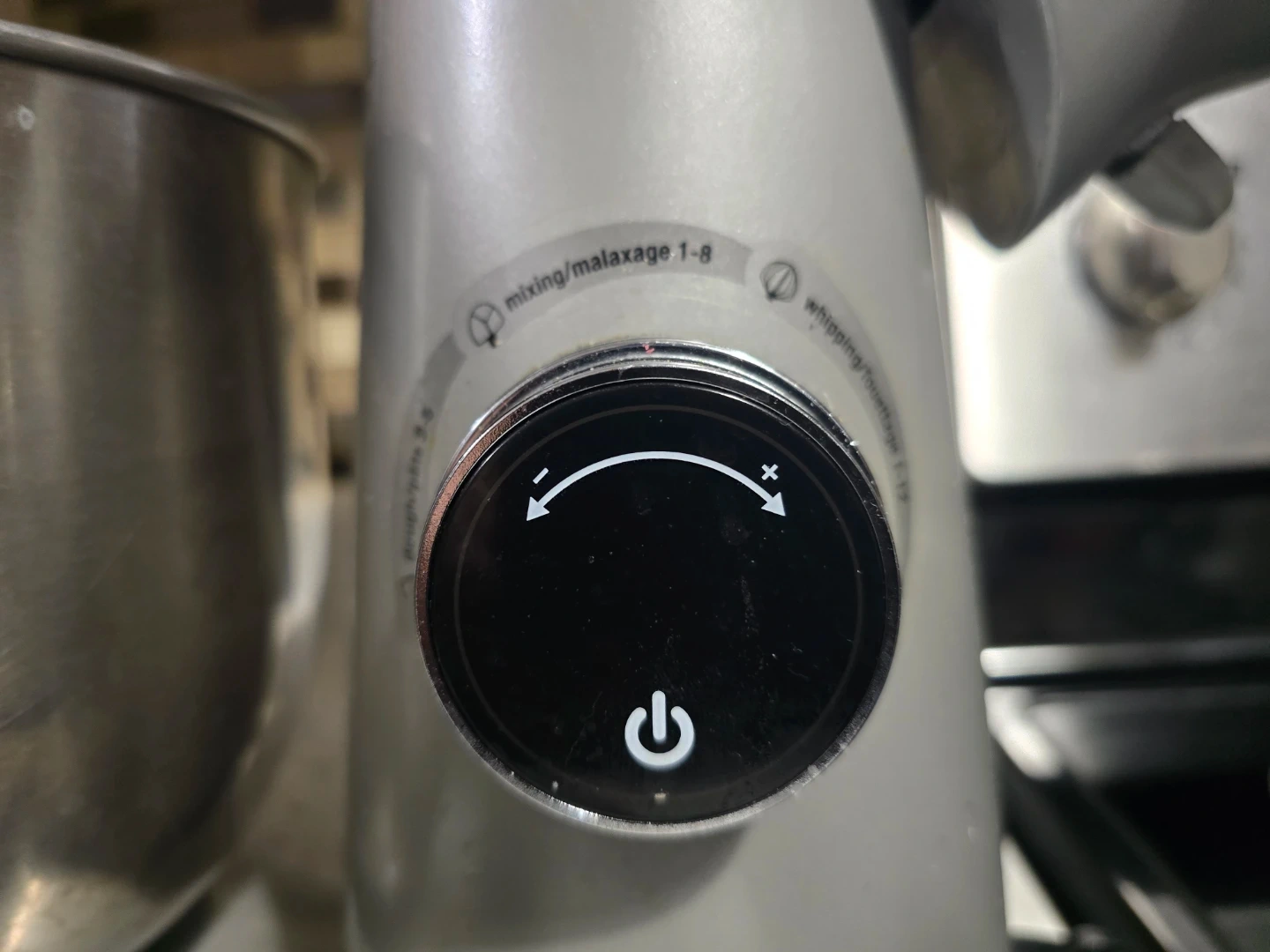 Silver Cuisinart stand mixer. It comes with a stainless steel bowl, whisk, dough hook, and splash guard. Features multiple speed settings for various baking and home cooking needs.