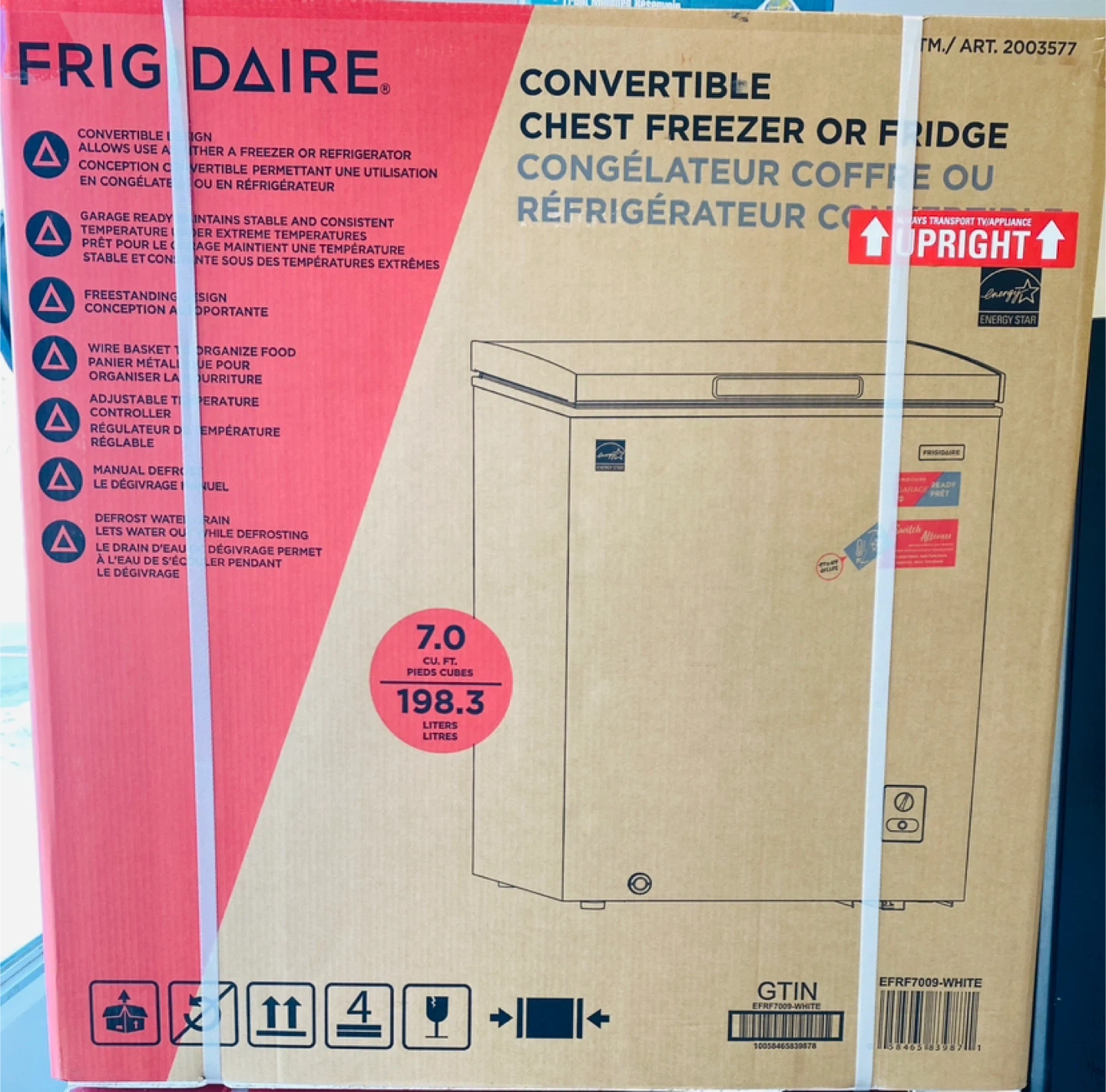 Frigidaire 7 cu Chest Freezer, garage ready convertible model, ie, can operate as either a fridge or a freezer. Measurements are 33” x 22”, 33” high New in factory box, two year factory warranty. $295. 204. 663.9988