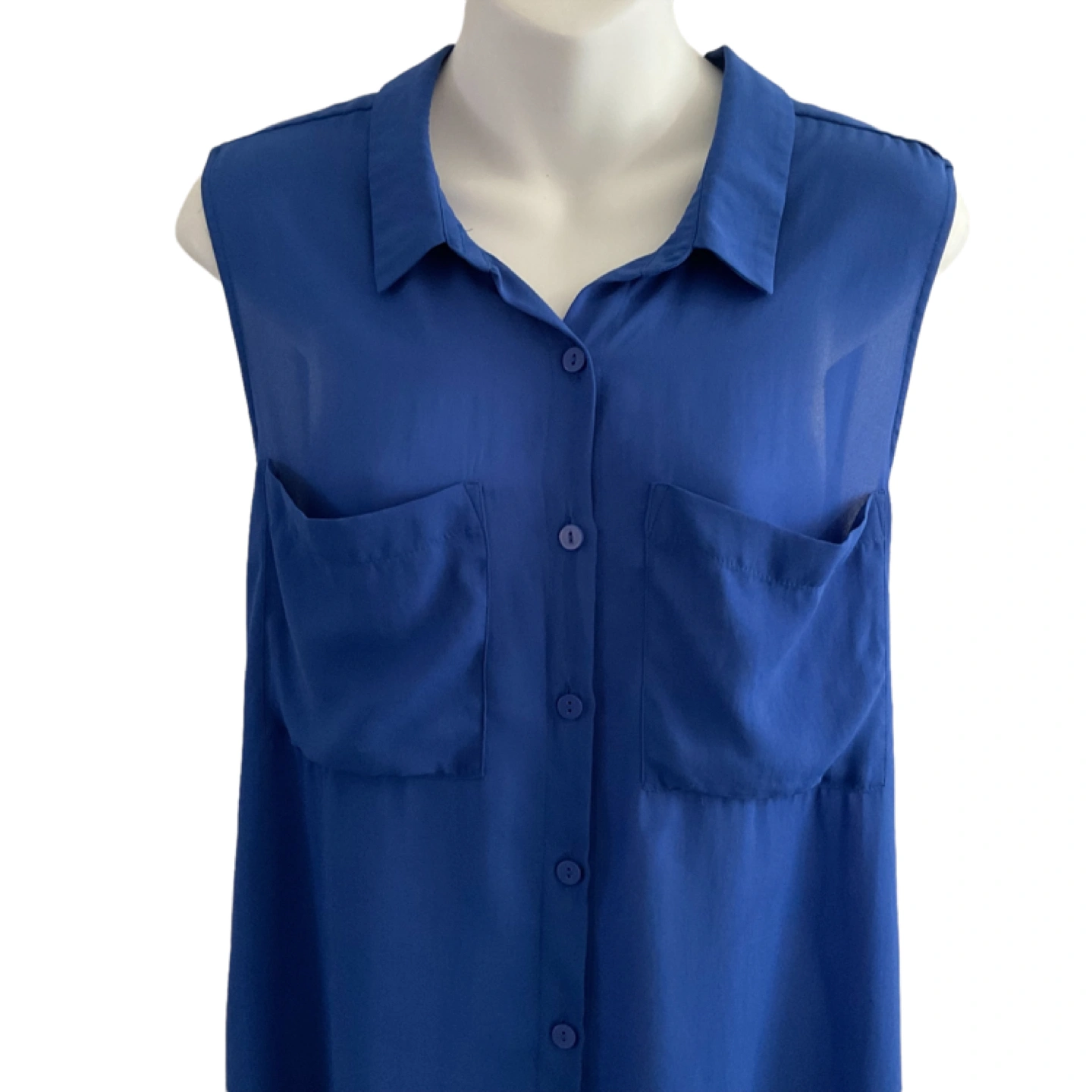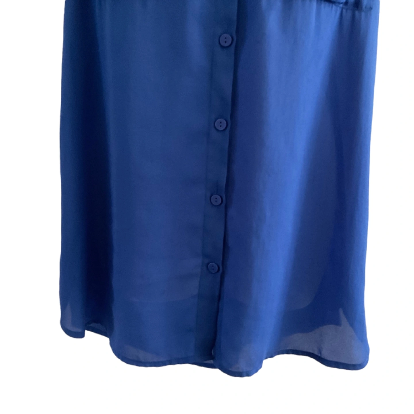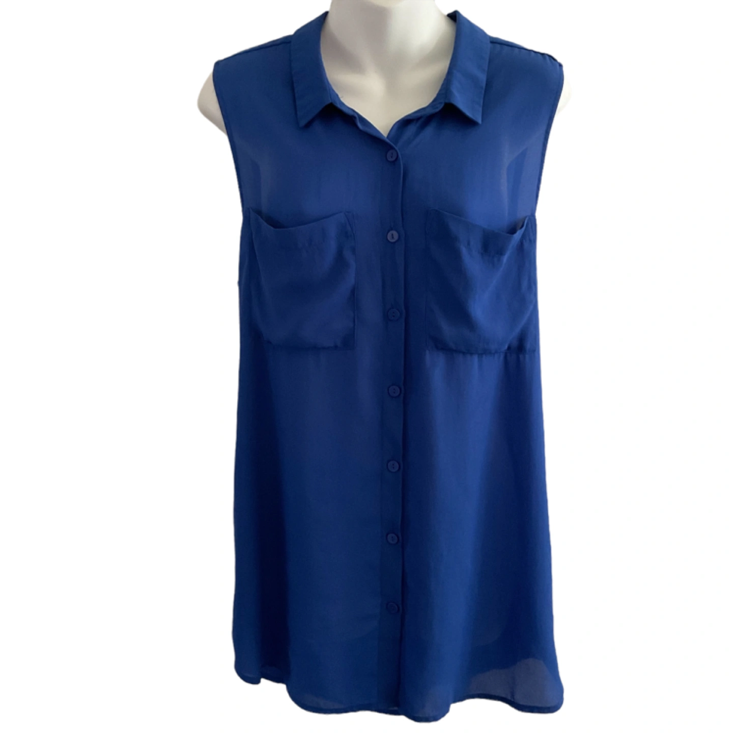 Size Medium. Tag missing. Vibrant blue, semi-sheer material. 2 front pockets. Button down. Longer at back. Measurements: 22” armpit to armpit, 28” length at front, 30” at back. Pick up is in the Islington and Albion area. Non-smoking home.
