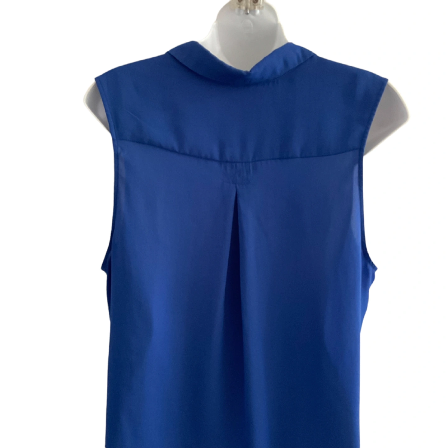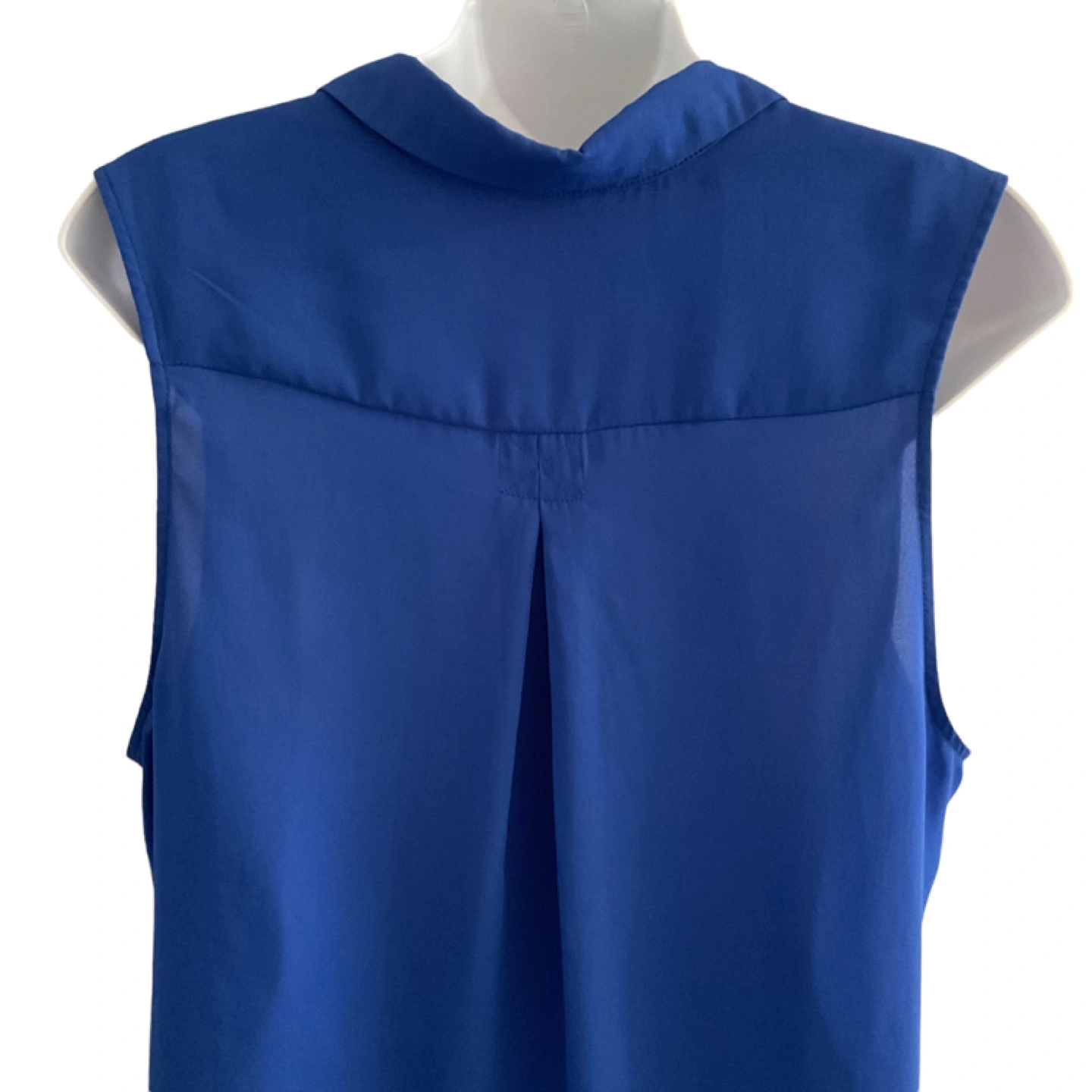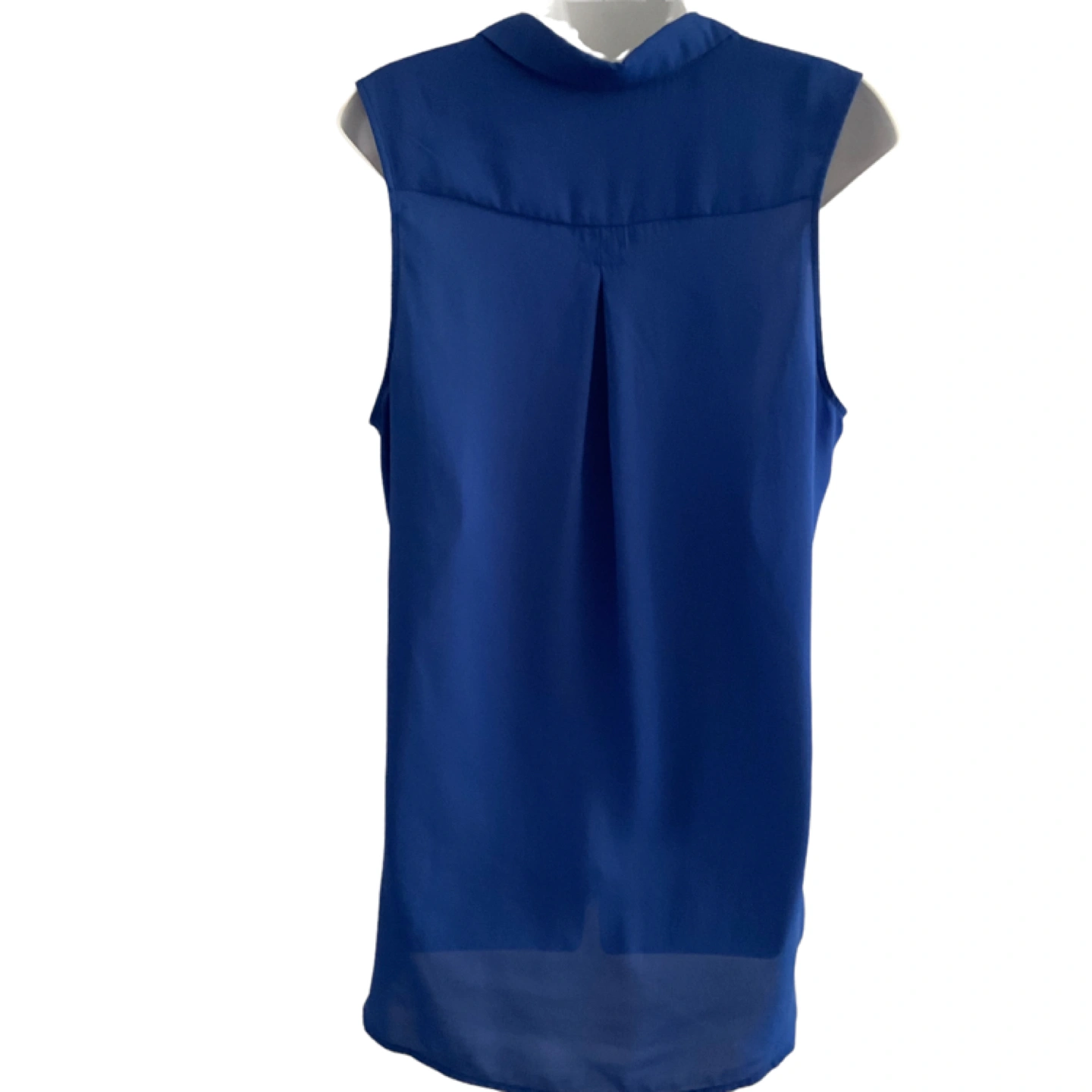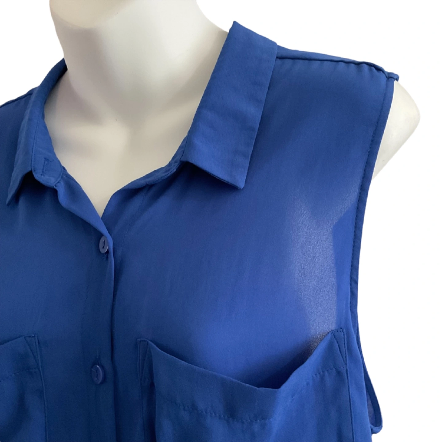 Size Medium. Tag missing. Vibrant blue, semi-sheer material. 2 front pockets. Button down. Longer at back. Measurements: 22” armpit to armpit, 28” length at front, 30” at back. Pick up is in the Islington and Albion area. Non-smoking home.