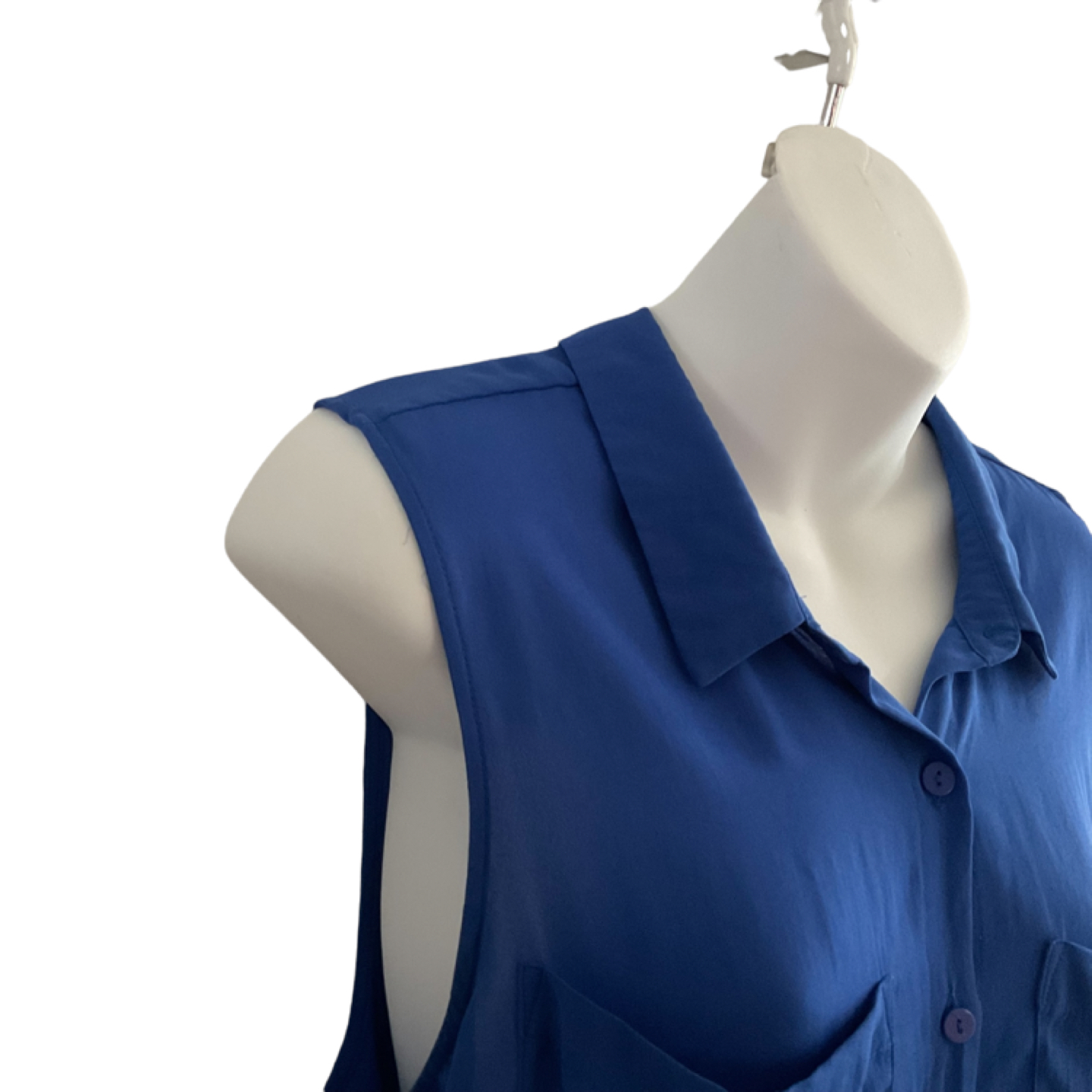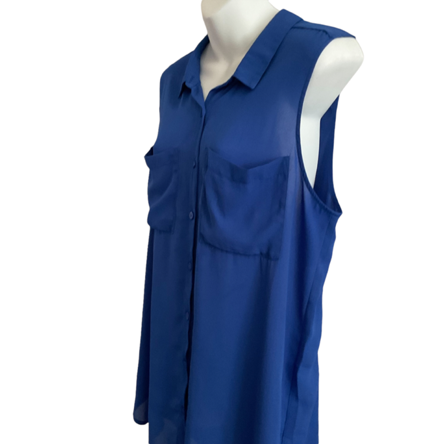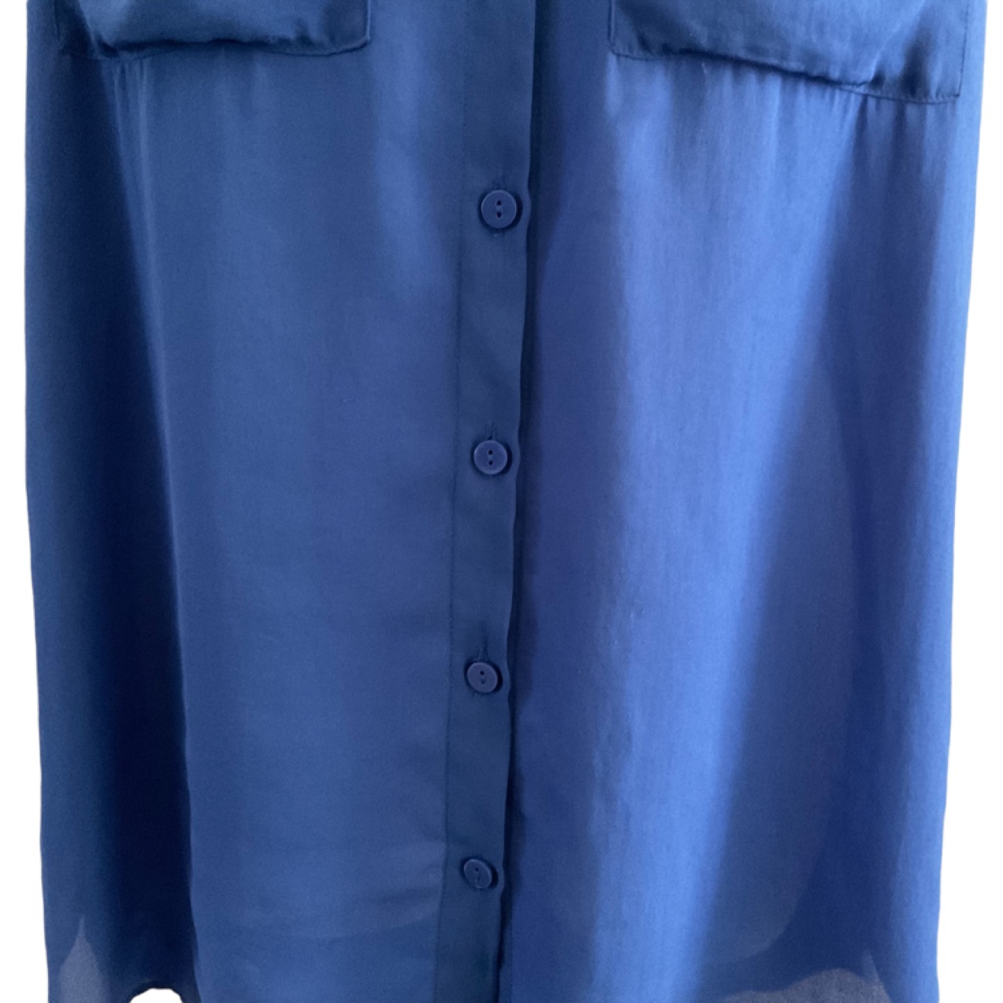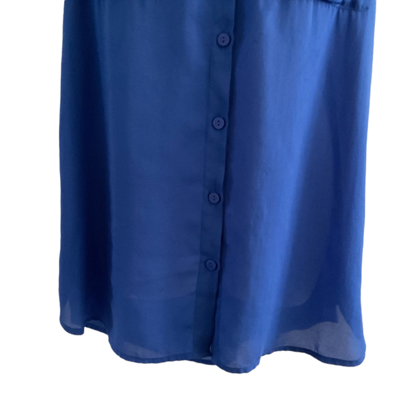 Size Medium. Tag missing. Vibrant blue, semi-sheer material. 2 front pockets. Button down. Longer at back. Measurements: 22” armpit to armpit, 28” length at front, 30” at back. Pick up is in the Islington and Albion area. Non-smoking home.