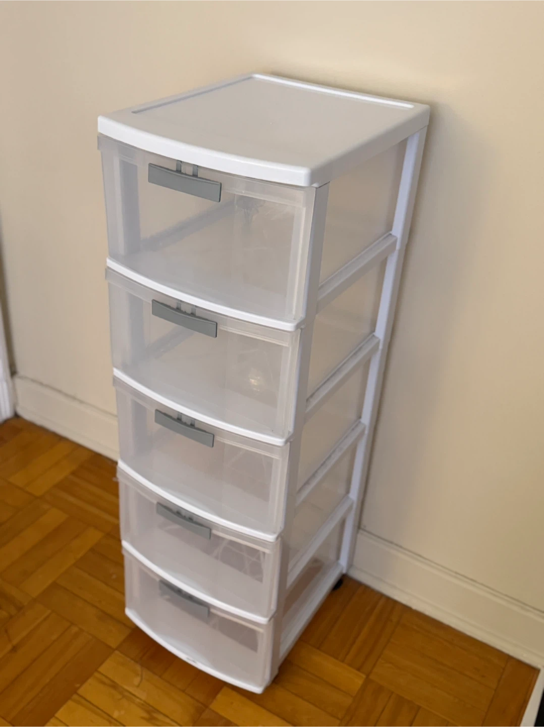 Looking to declutter? This Sterilite 5-drawer tower is perfect for organizing your space! It's in great condition and ready to help you tidy up any room. The drawers are clear so you can easily see what's inside. Great for storing clothes, toys, or office supplies