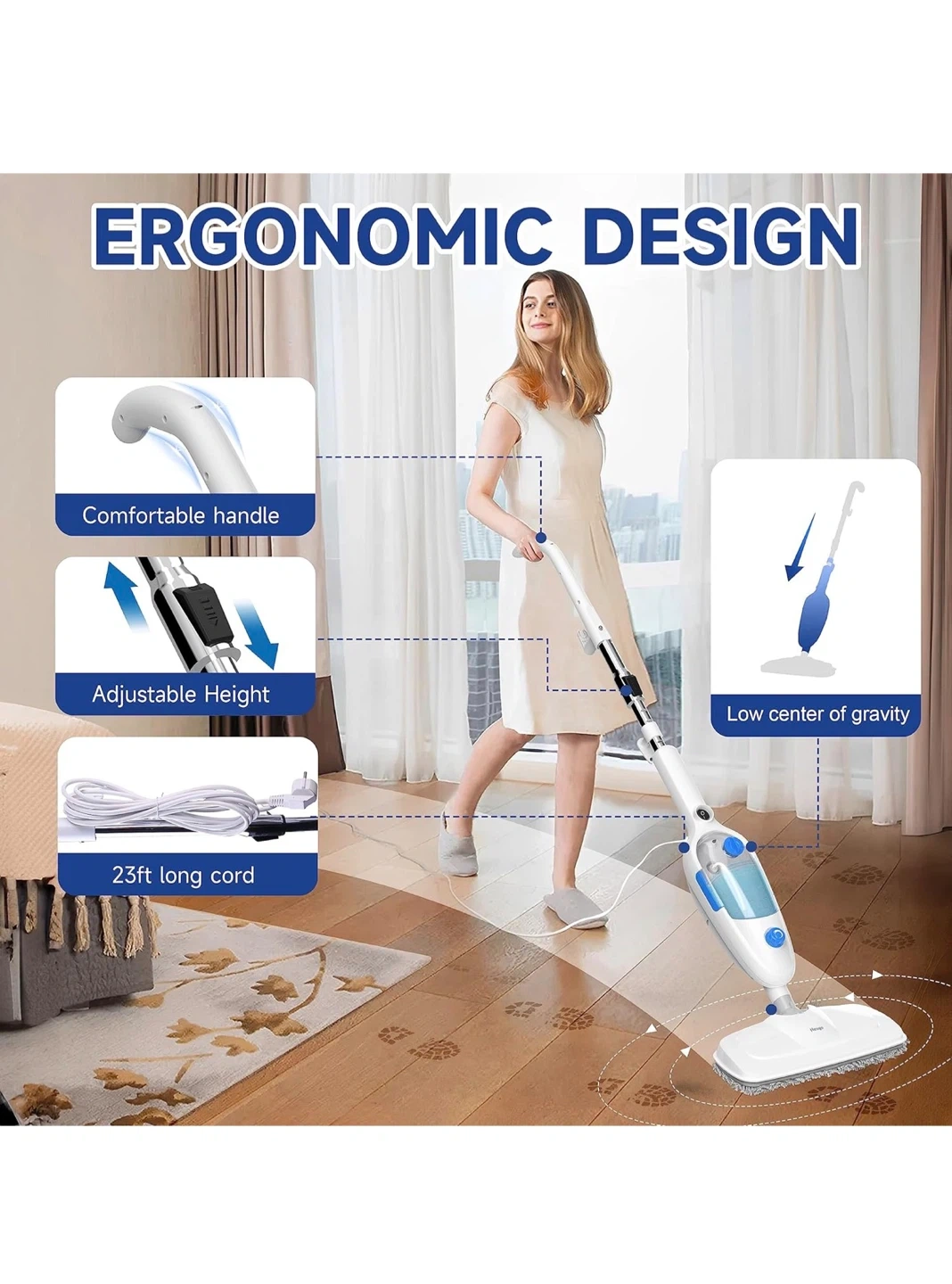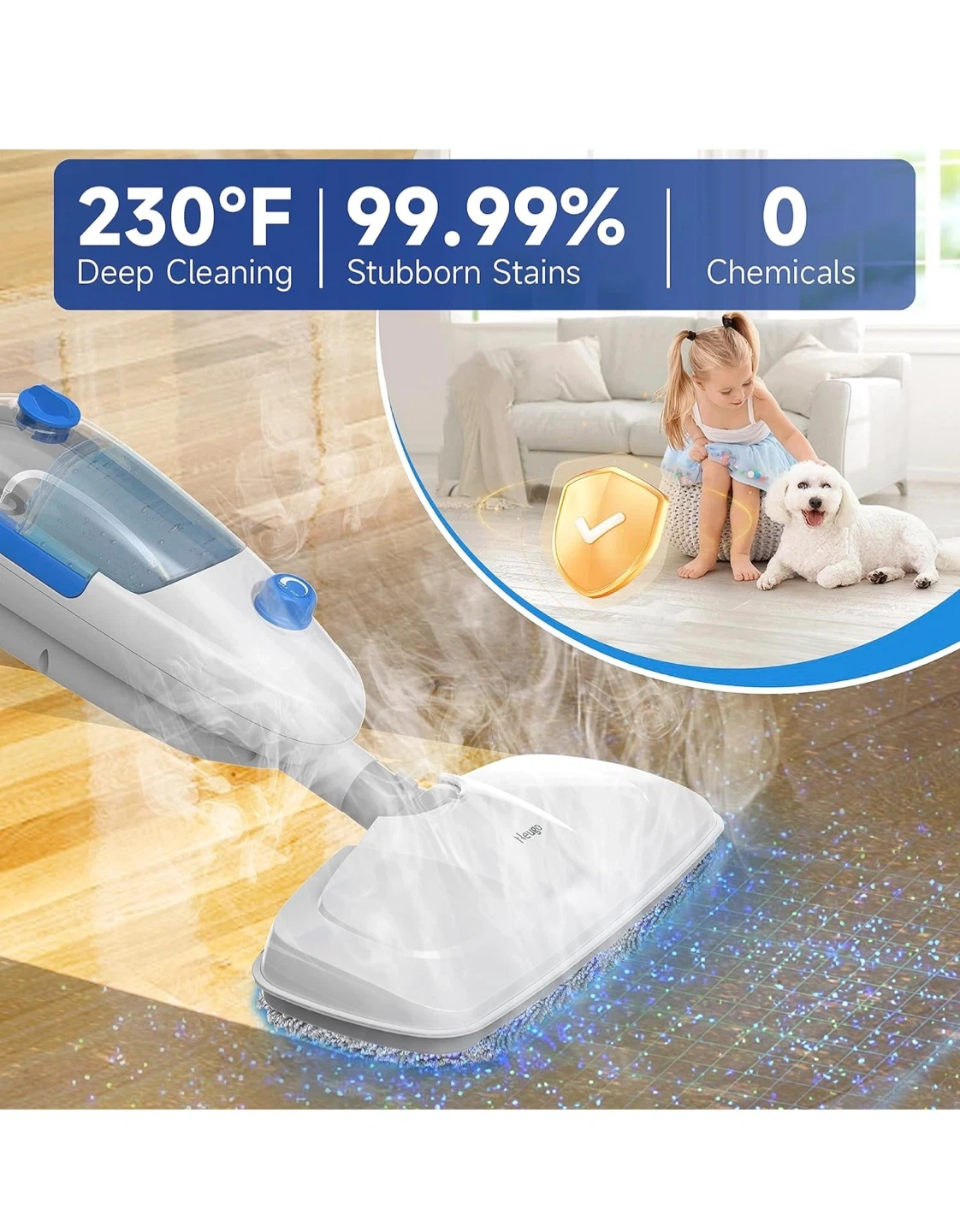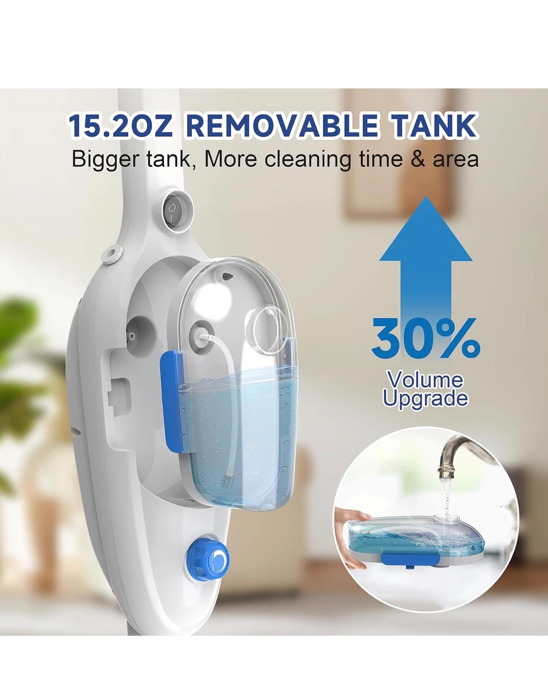 This steam mop effectively cleans hardwood, vinyl, laminate, tile, marble, and carpet floors. It features adjustable steam settings and a 15.2 oz removable tank for extended cleaning. The quick-dry function is perfect for hardwood, vinyl, and laminate.