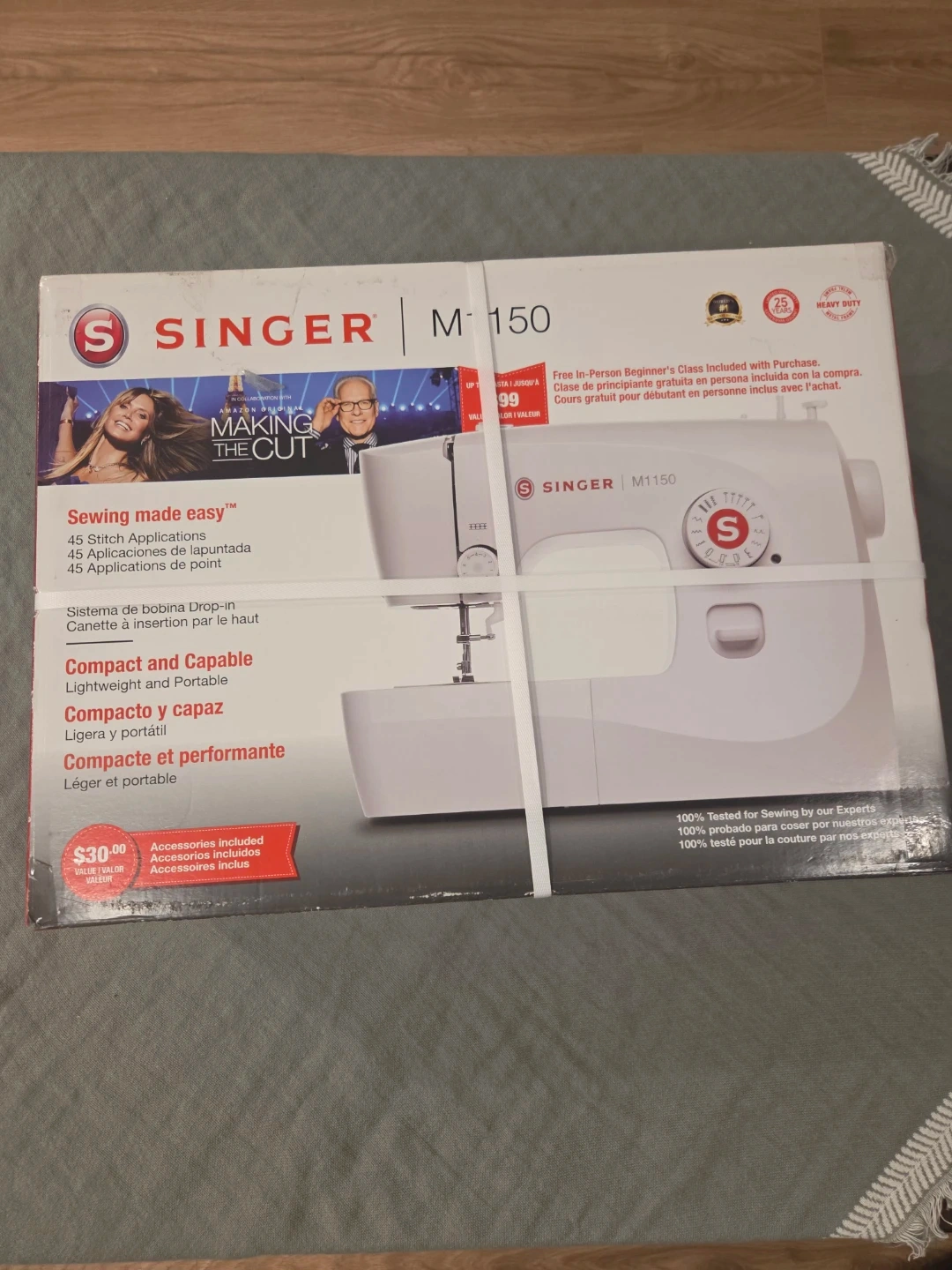 This SINGER M1150 sewing machine offers 45 stitch applications for various projects. It's compact and portable for easy use. Features include a top drop-in bobbin and auto-set buttonholes. Suitable for beginner sewers! Unused, untouched, unopened.