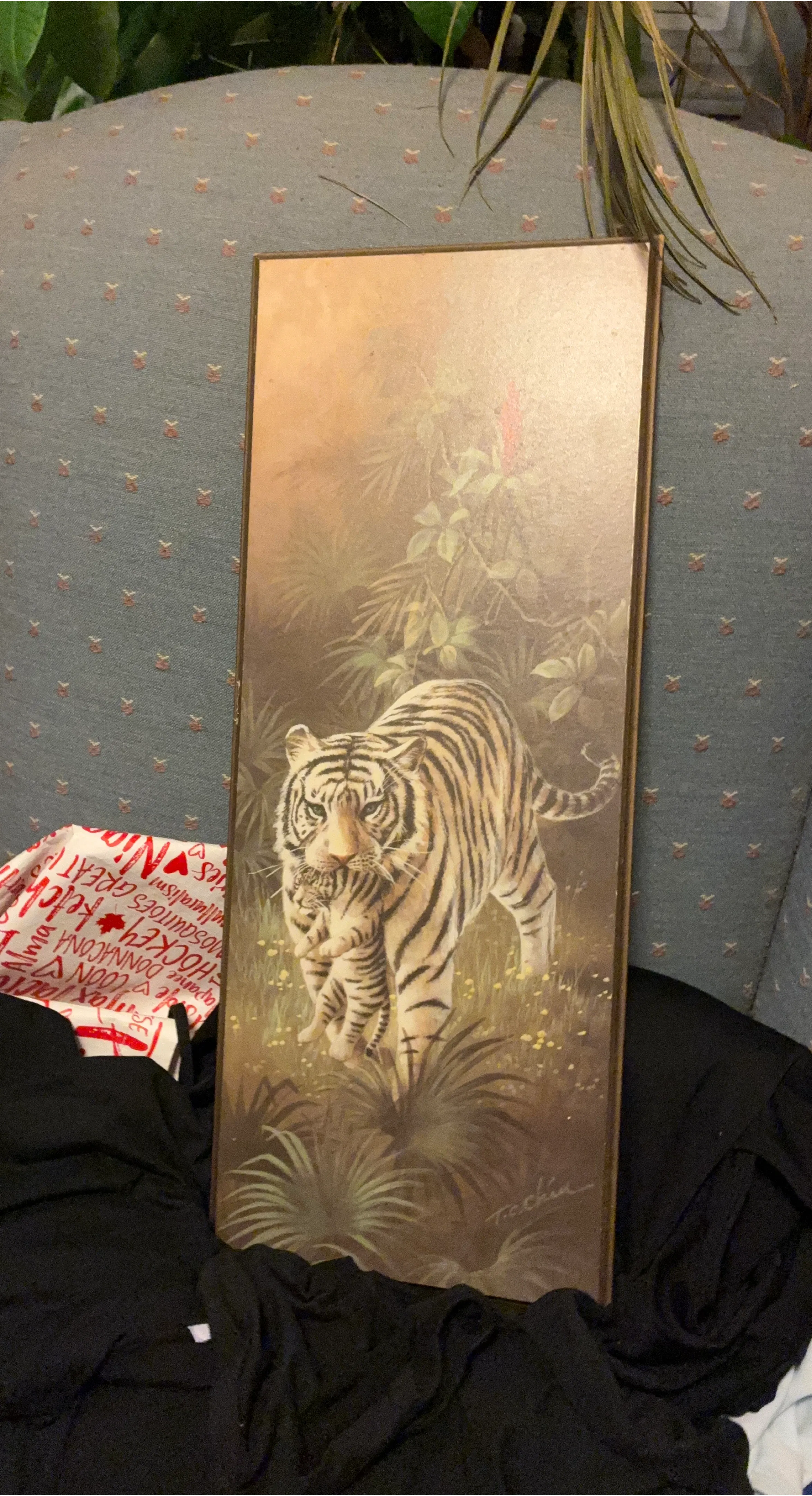 This is a framed print featuring a tiger carrying its cub through a grassy landscape. The artwork has a vintage feel and a warm, earthy colour palette. It's signed by the artist 'Tachin' in the bottom right corner.