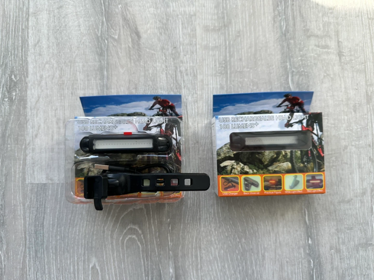 Set of two USB rechargeable bike headlights, each with 100 lumens output. Includes USB charger for convenient power-ups. Front white light effect and rear red light effect options are shown.