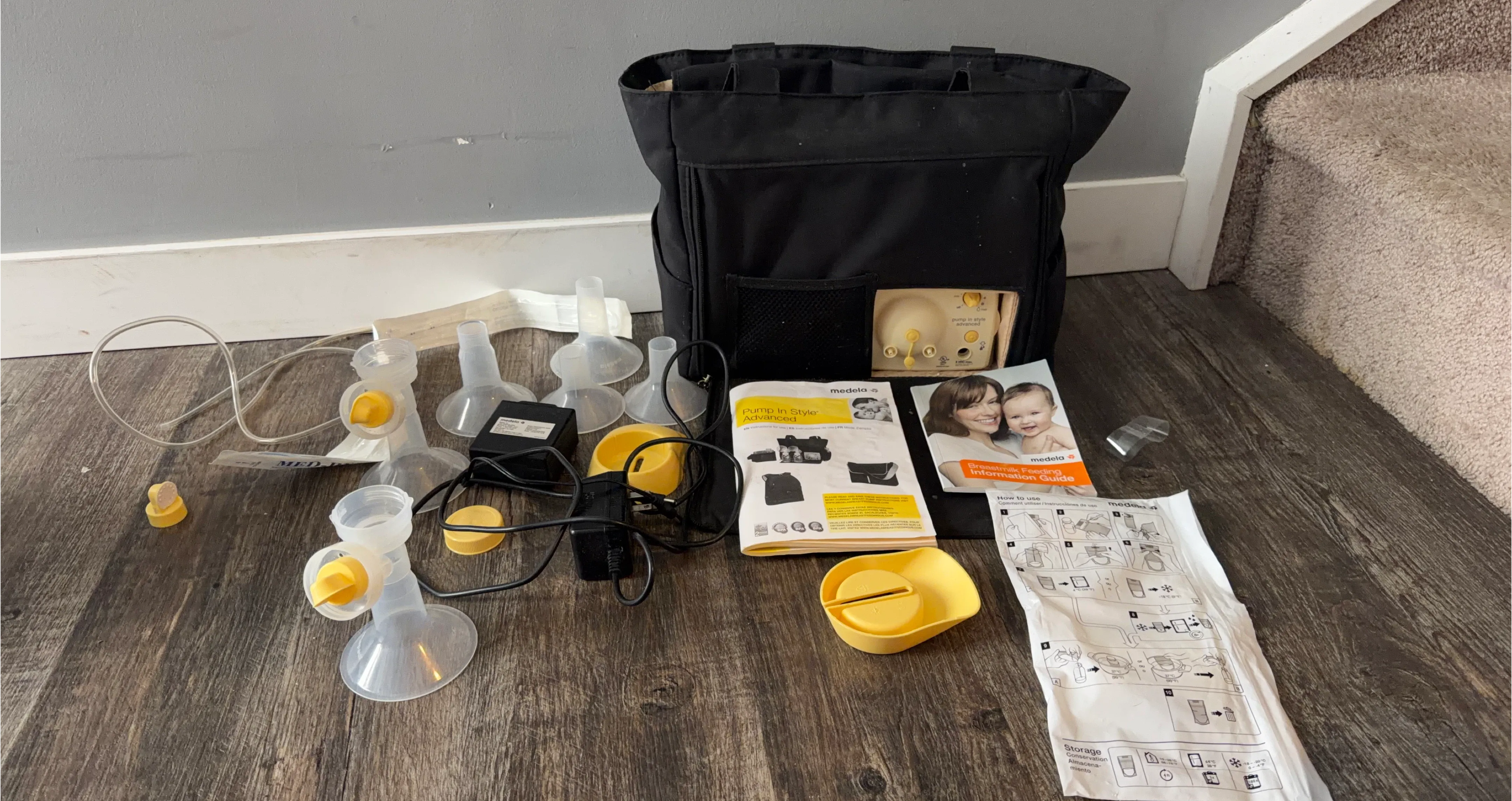 This is a Medela Pump In Style Advanced double electric breast pump. It comes with a black tote bag and various accessories. Includes instruction manuals for use and feeding information.