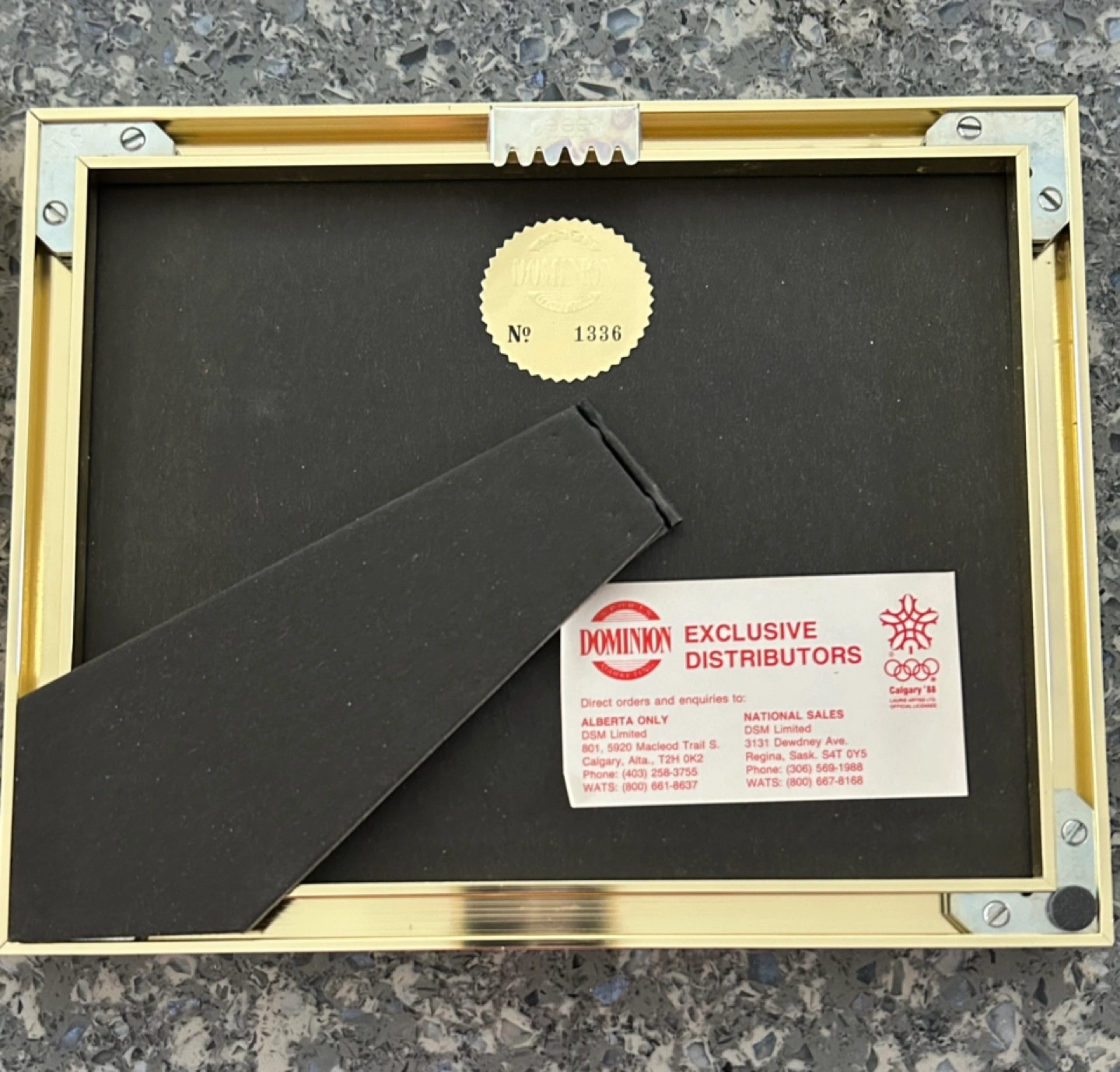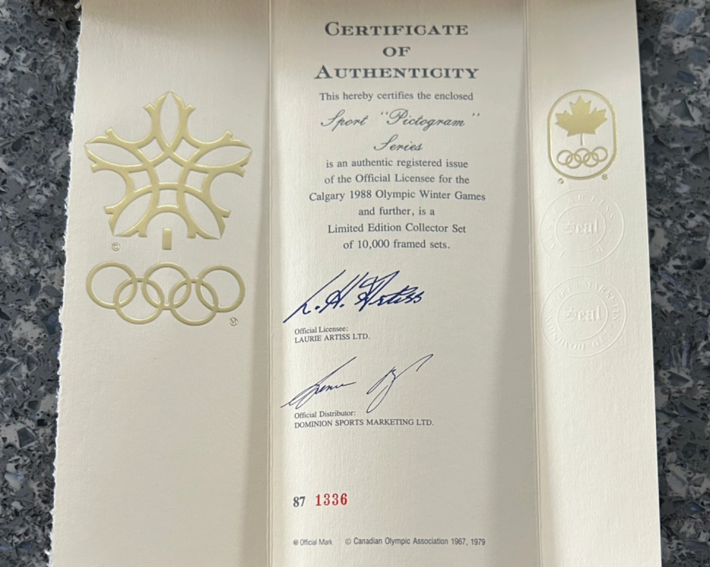 Mint condition. Framed set of twelve commemorative pins. Features various winter sports. Limited edition. Gold-toned frame. Includes numbered certificate of authenticity 1336/10000