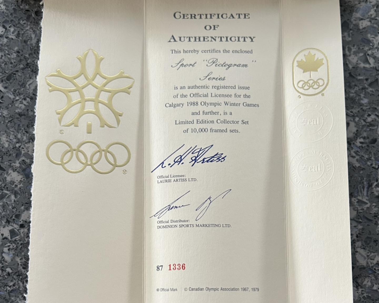 Mint condition. Framed set of twelve commemorative pins. Features various winter sports. Limited edition. Gold-toned frame. Includes numbered certificate of authenticity 1336/10000