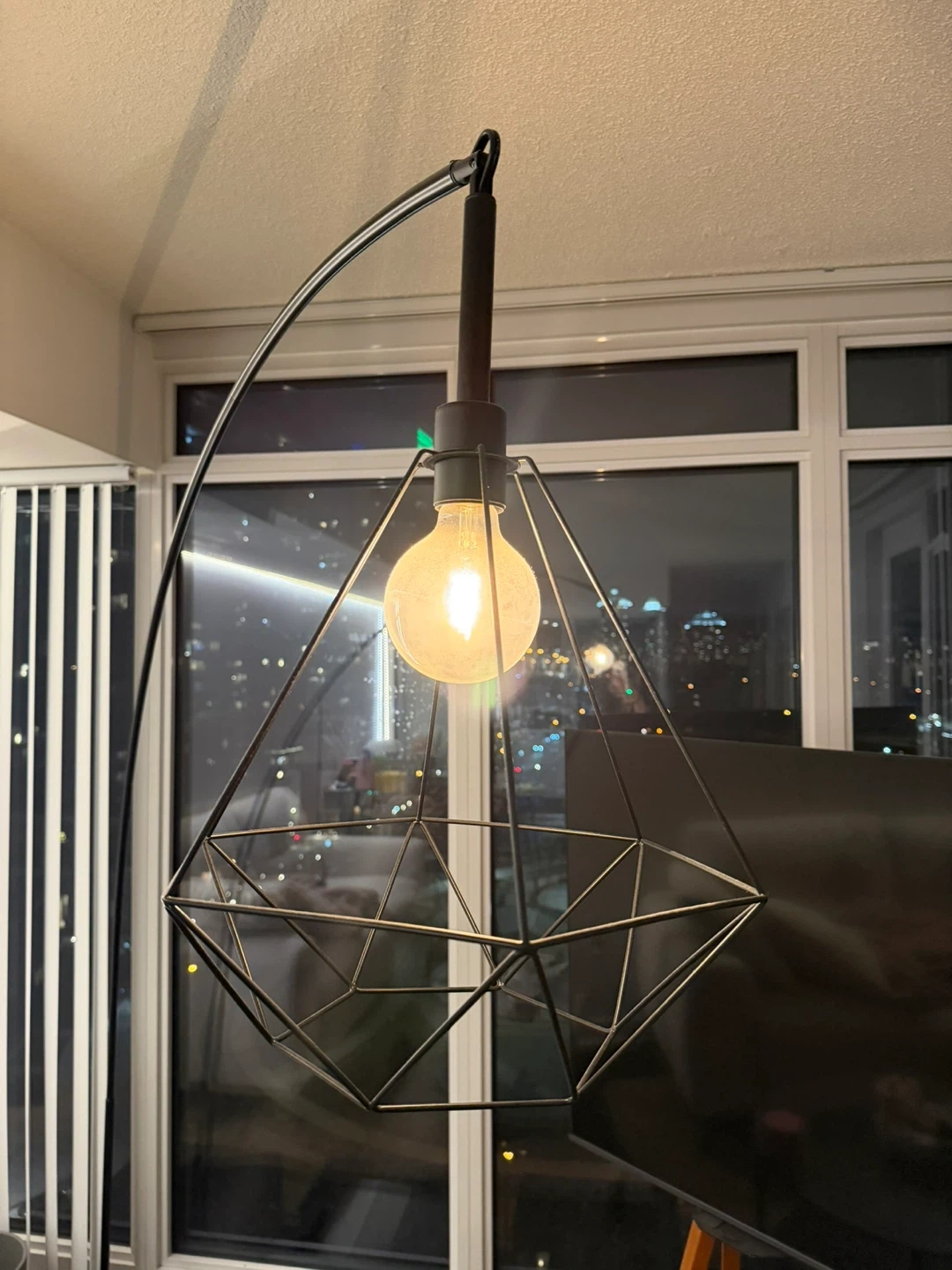 This arc floor lamp features a striking geometric metal shade and a warm Edison-style bulb. It's perfect for adding a modern industrial touch to your living space. The lamp's curved arm provides adjustable lighting over seating areas.
