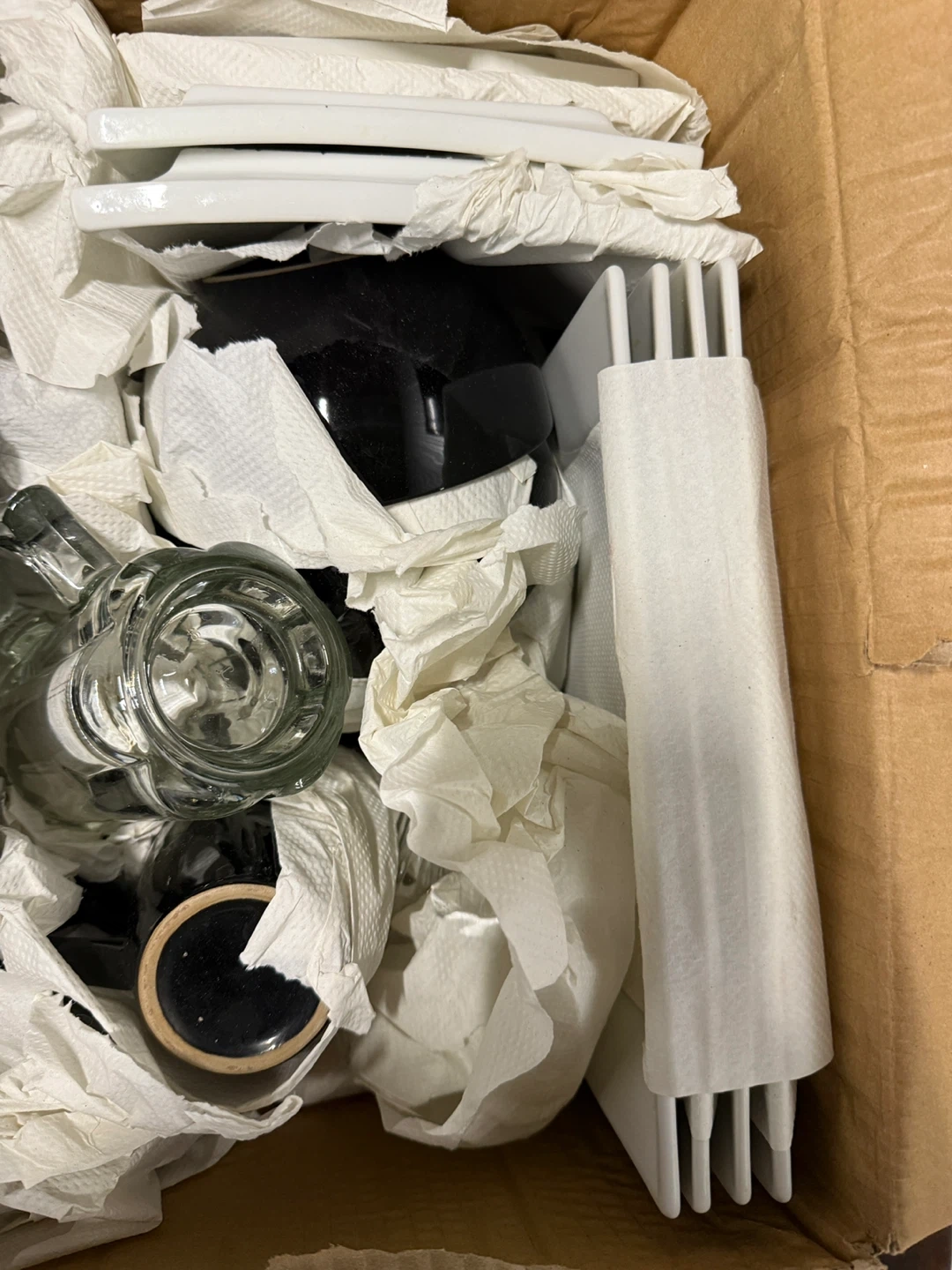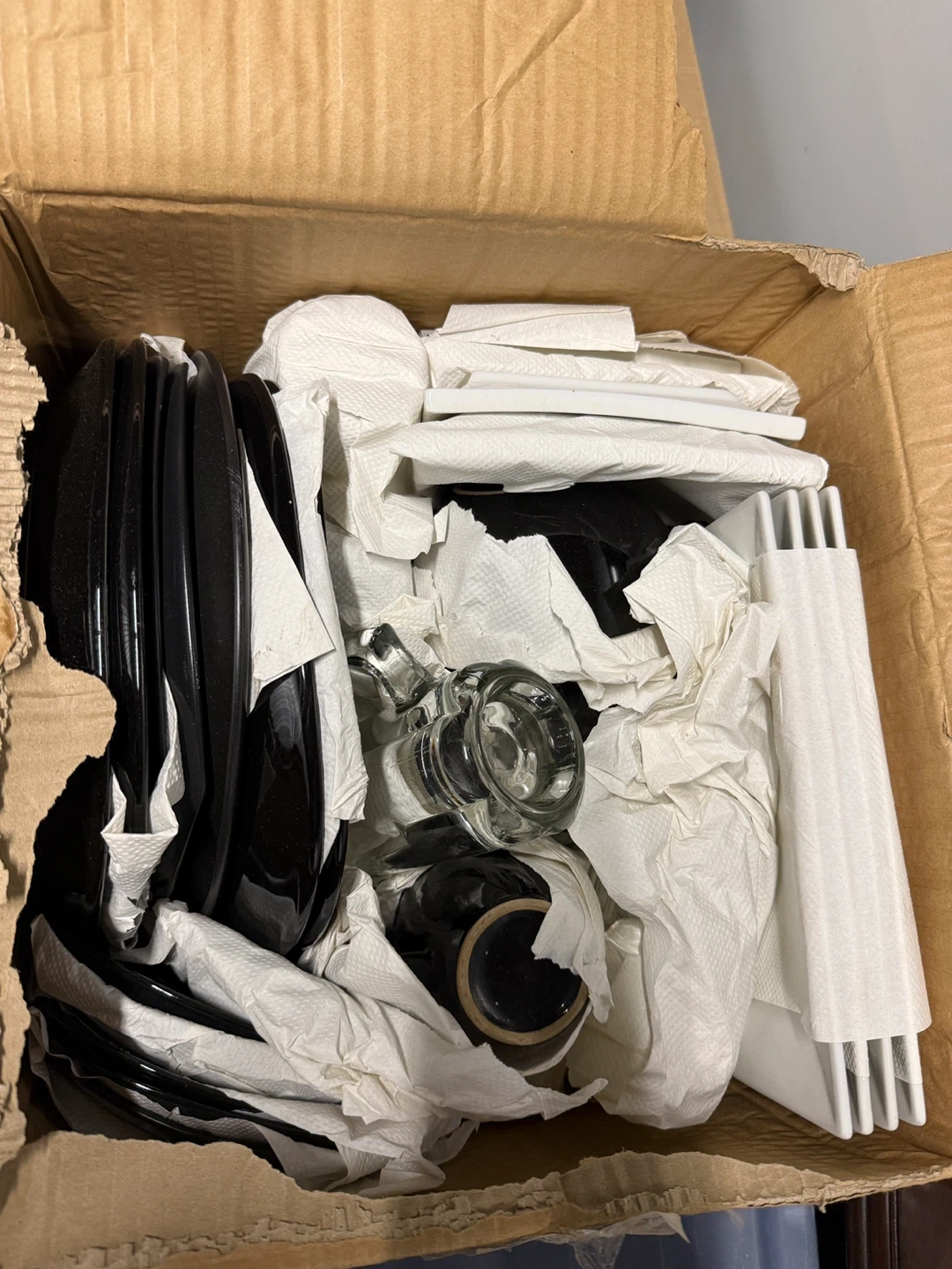 This is a set of black dishes and clear glass items. Includes plates, bowls, and glasses. Dishware is black, glasses are clear. Perfect for everyday use!