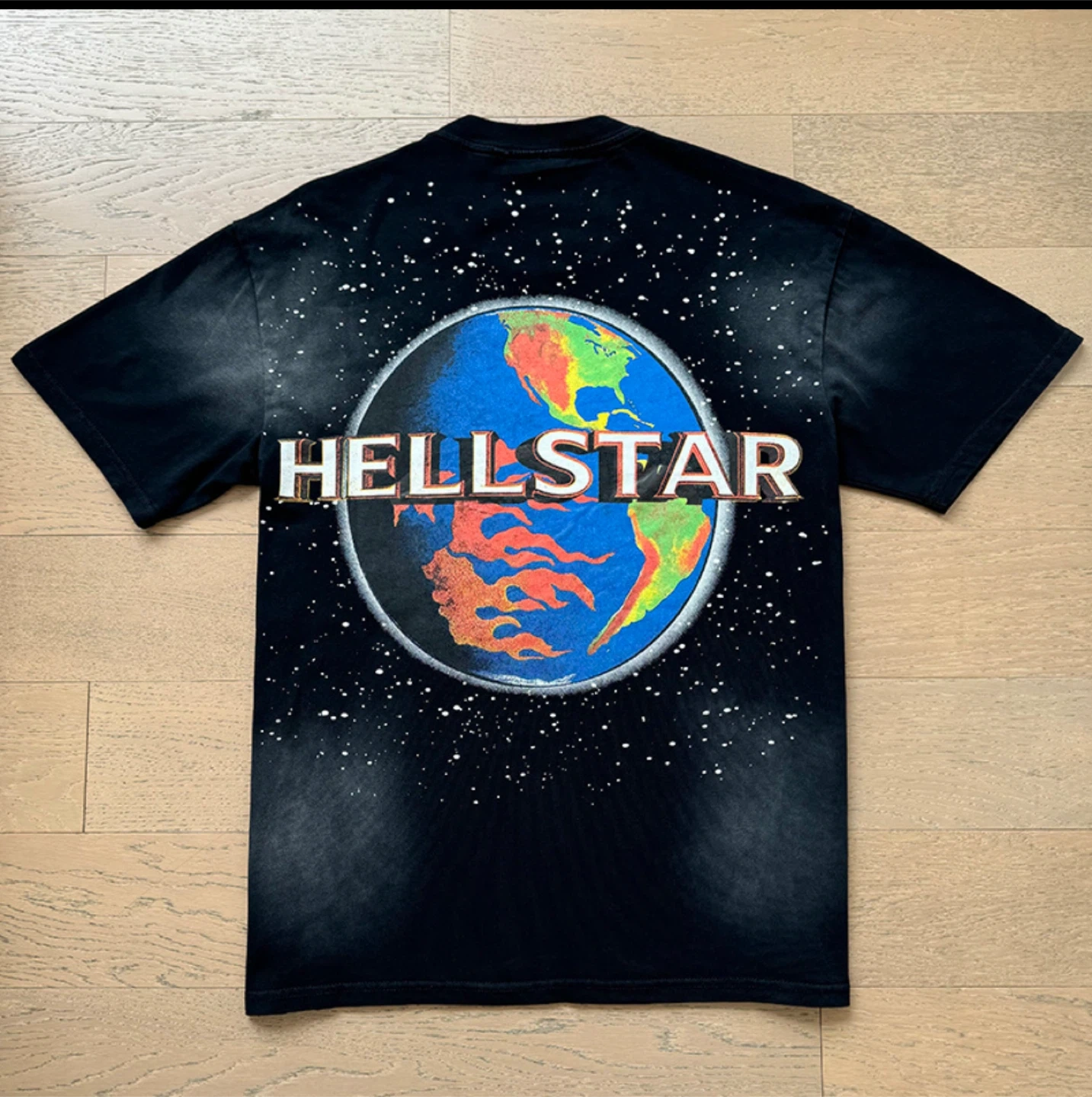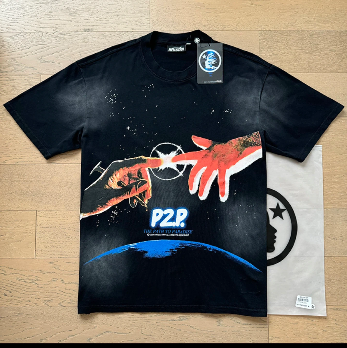 This HELLSTAR t-shirt features a black wash with a striking P2P graphic on the front and a large HELLSTAR logo on the back. It's made of cotton material. Comes in a size medium.