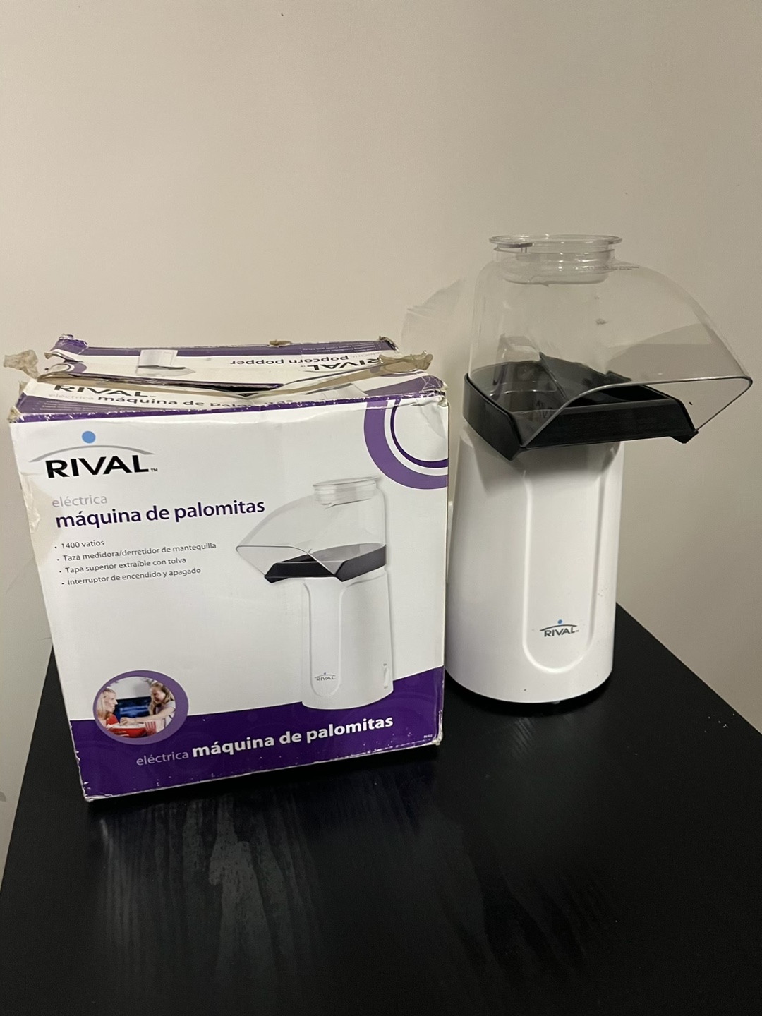 Like new in box Rival electric popcorn maker. 1400 watts. Includes measuring cup/butter melter. Removable lid with hopper. On/off switch.